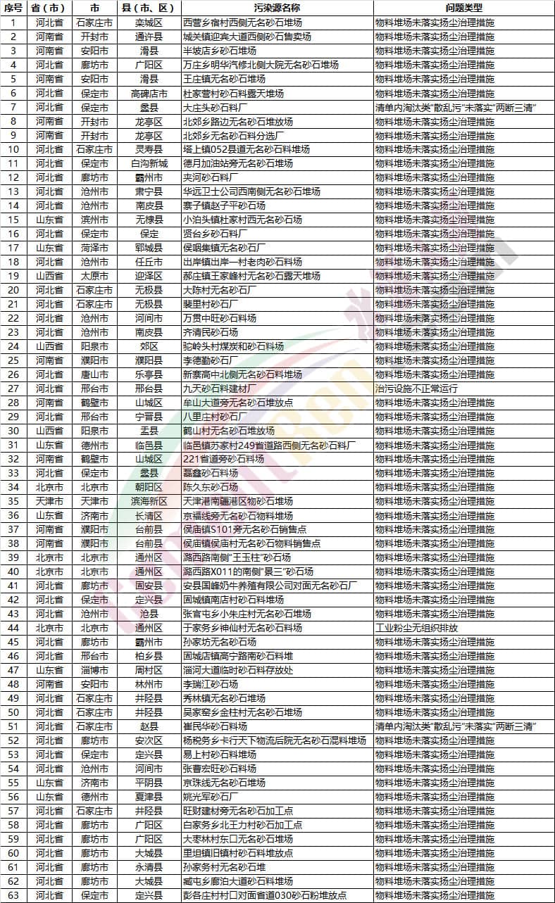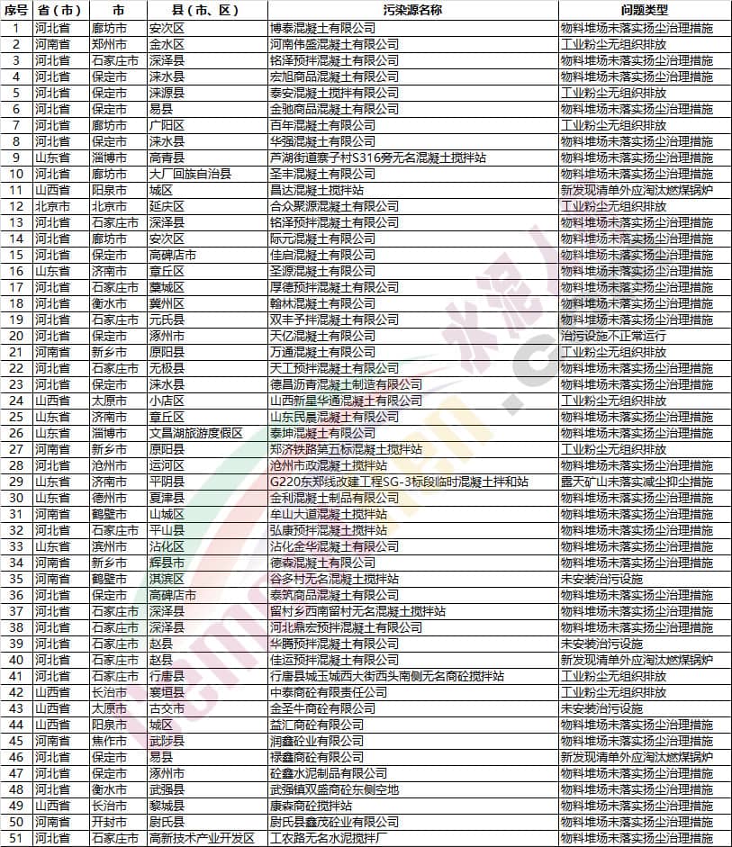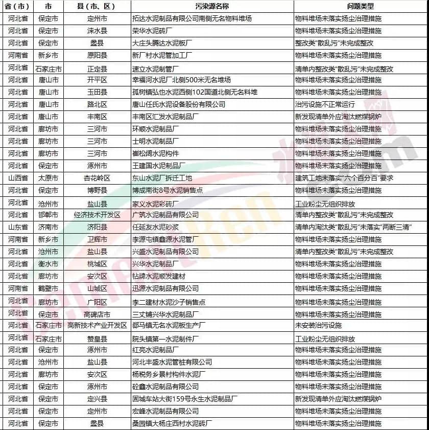 【水泥人網(wǎng)】7月份,2018-2019年藍(lán)天保衛(wèi)戰(zhàn)重點(diǎn)區(qū)域強(qiáng)化督查工作繼續(xù)開展,200個(gè)督查組按照工作方案要求,對京津冀及周邊地區(qū)204個(gè)縣(市、區(qū))進(jìn)行督查。發(fā)現(xiàn)多個(gè)涉氣環(huán)境問題,其中涉及水泥企業(yè)、混凝土(商砼)企業(yè)、砂石企業(yè)的如下:
