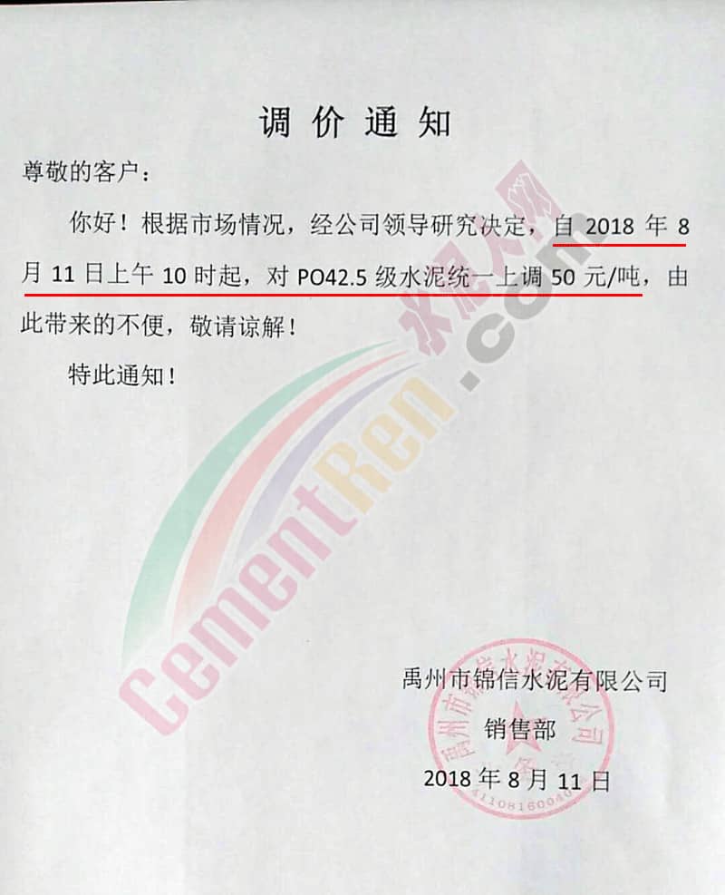 天瑞集團(tuán)許昌水泥有限公司價(jià)格調(diào)整告知函稱,根據(jù)目前環(huán)保力度增大,為了做好去產(chǎn)能和節(jié)能減排工作,有效消化錯(cuò)峰生產(chǎn)、原材料漲價(jià)帶來的成本增加,本著長(zhǎng)期誠(chéng)信服務(wù)、深度合作、互惠共贏的經(jīng)營(yíng)理念,為了公司的可持續(xù)發(fā)展,自2018年8月11日上午10點(diǎn)起對(duì)PC32.5R級(jí)水泥統(tǒng)一上調(diào)20元/噸,PO42.5級(jí)水泥統(tǒng)一上調(diào)50元/噸。