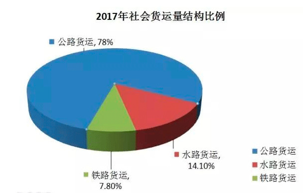 2017年我國完成社會貨運量472.4億噸,貨運周轉(zhuǎn)量19.3億噸,這份全球第一的貨運成績單里,公路運輸占78%、水路運輸占14.1%,鐵路運輸占7.8%。