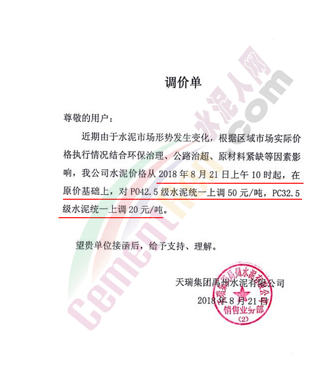 平頂山市強達(dá)水泥有限公司調(diào)價通知稱,由于原材料價格上漲,水泥企業(yè)成本增加且?guī)齑孑^低。根據(jù)周邊市場行情,經(jīng)公司研究決定 ,自8月21中午12點起32.3R級水泥在原價基礎(chǔ)上上調(diào)20元/噸。