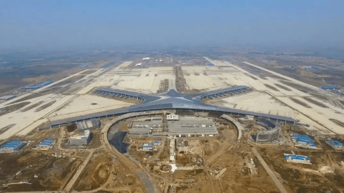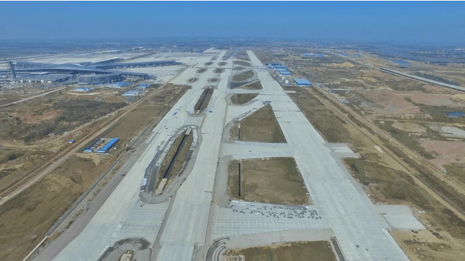 青島新機(jī)場(chǎng)工程一期共建設(shè)兩條獨(dú)立運(yùn)行的平行遠(yuǎn)距跑道,其中,東跑道長(zhǎng)3600米、寬60米,飛行區(qū)等級(jí)為4F,可起降當(dāng)前最大空客380、波音747機(jī)型;西跑道長(zhǎng)3600米、寬45米,飛行區(qū)等級(jí)4E。跑道間距2184米,西跑道相對(duì)東跑道向南錯(cuò)開500米。