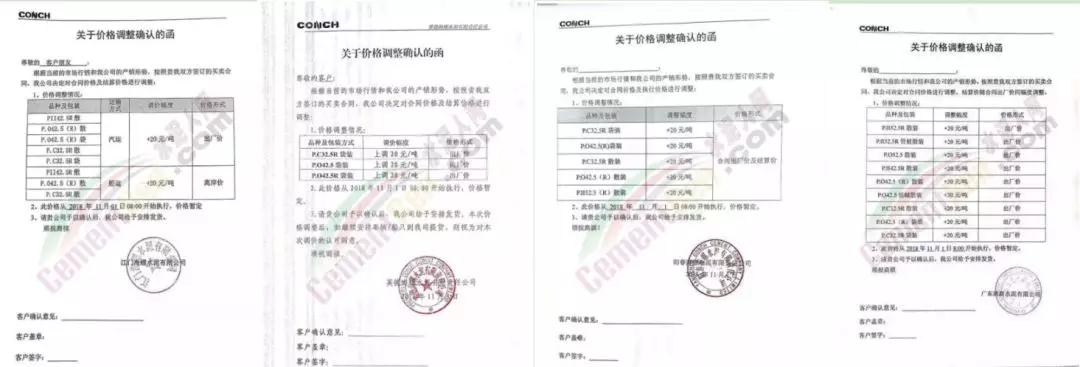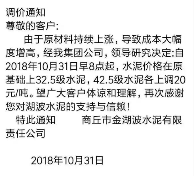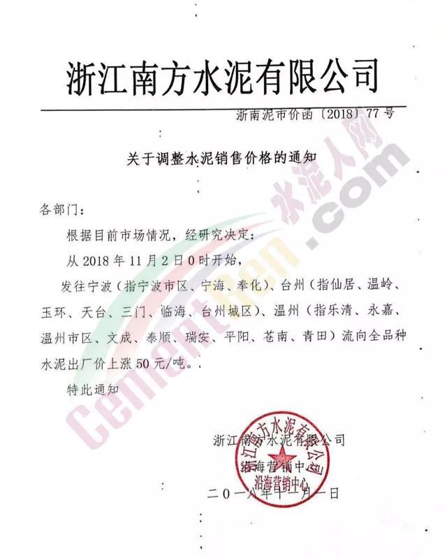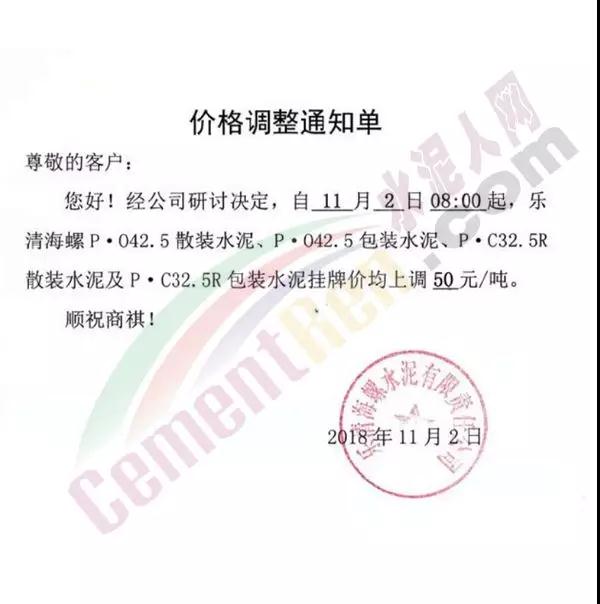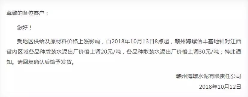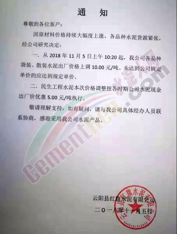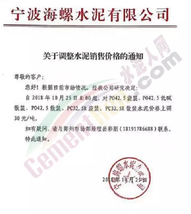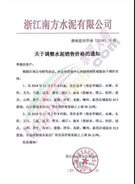 10月29日上海海螺水泥銷售有限公司發(fā)了一份南方水泥的漲價通知,漲價函稱經(jīng)公司研究決定自10月29日零時開始,公司從嘉善南方水泥發(fā)貨的42.5、52.5級水泥價格,在原價基礎(chǔ)上上調(diào)30元/噸。