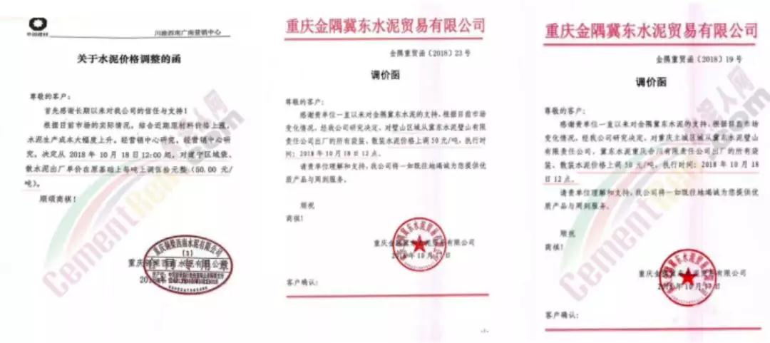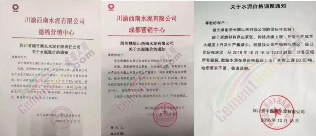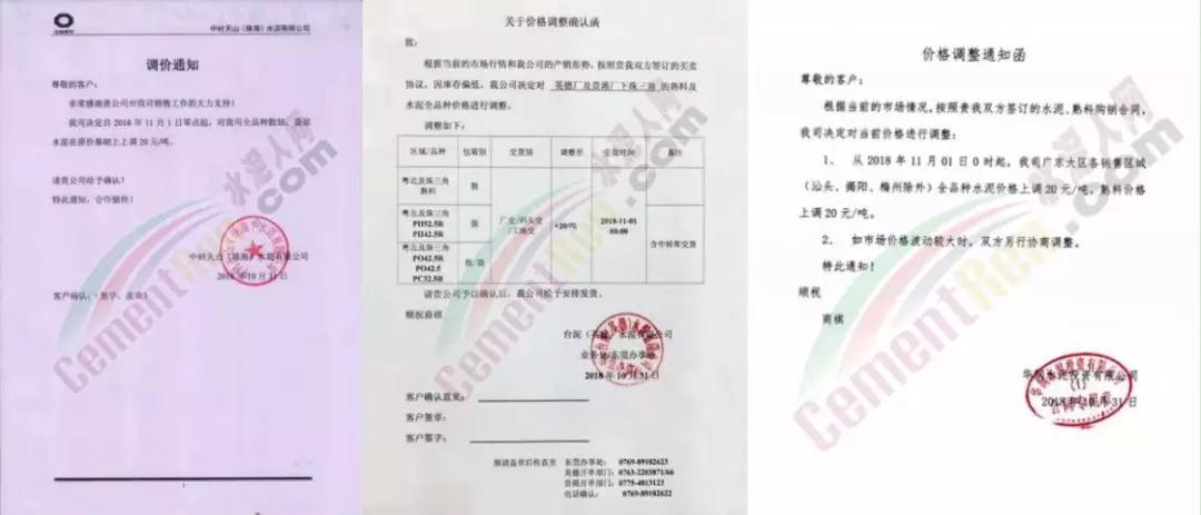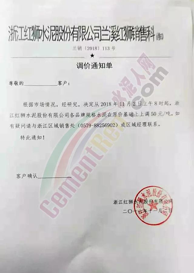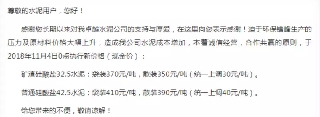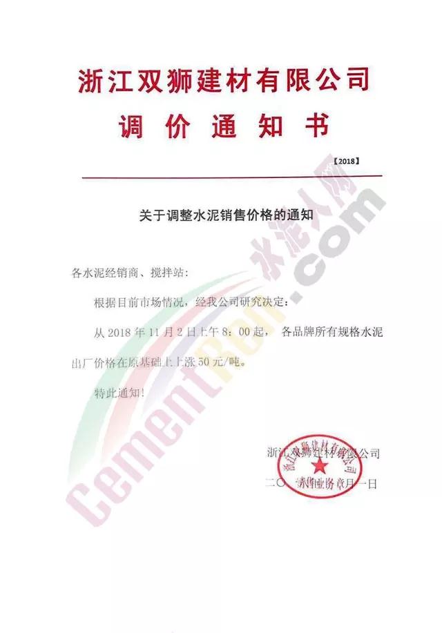 10月29日上海海螺水泥銷售有限公司發(fā)了一份南方水泥的漲價通知,漲價函稱經(jīng)公司研究決定自10月29日零時開始,公司從嘉善南方水泥發(fā)貨的42.5、52.5級水泥價格,在原價基礎(chǔ)上上調(diào)30元/噸。