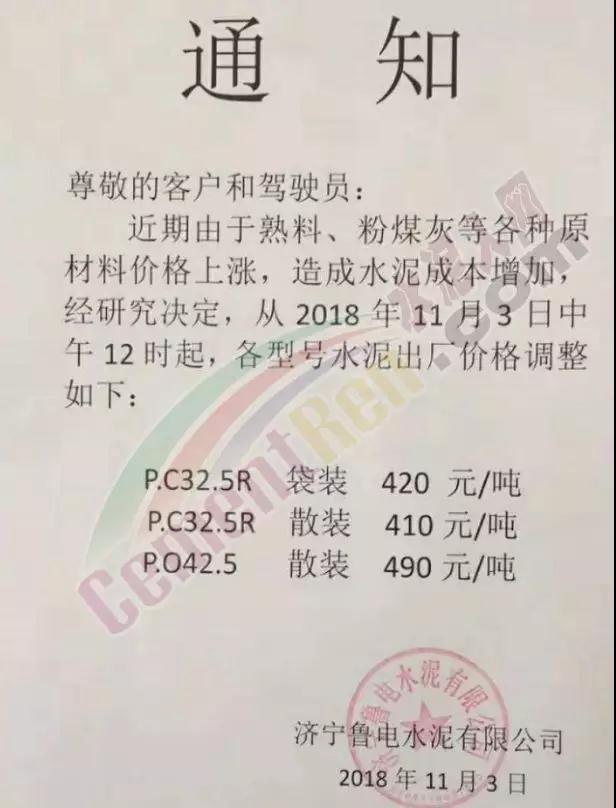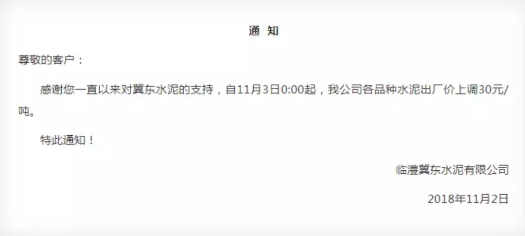 11月3日山西長治市主導(dǎo)企業(yè)通知自11月4日凌晨起上調(diào)各標(biāo)號水泥價格,其中32.5級水泥上調(diào)30元/噸,42.5水泥上調(diào)40元/噸。調(diào)價通知如下:
