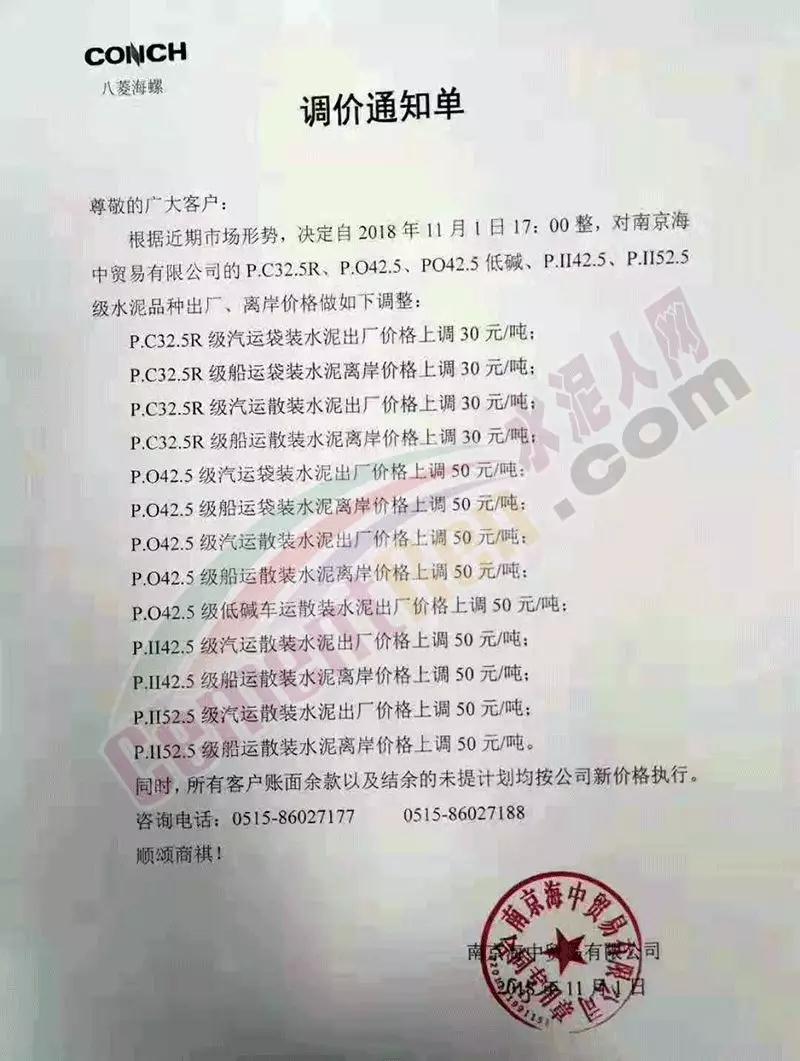 11月2日南京中聯(lián)水泥、鎮(zhèn)江北固海螺水泥上調(diào)水泥價格,其中32.5級水泥上調(diào)30元/噸。42.5級以上高標(biāo)號水泥上調(diào)50元/噸。漲價通知如下:
