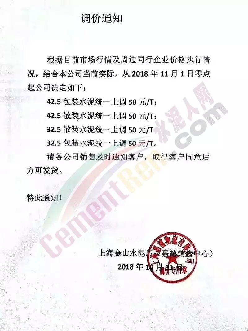11月1日上海市主要品牌水泥發(fā)布調(diào)價通知,各標(biāo)號水泥價格上調(diào)50元/噸。