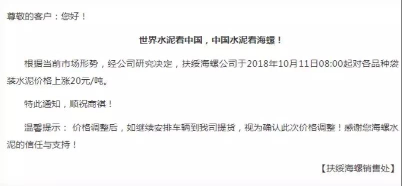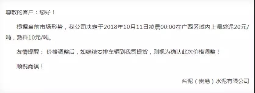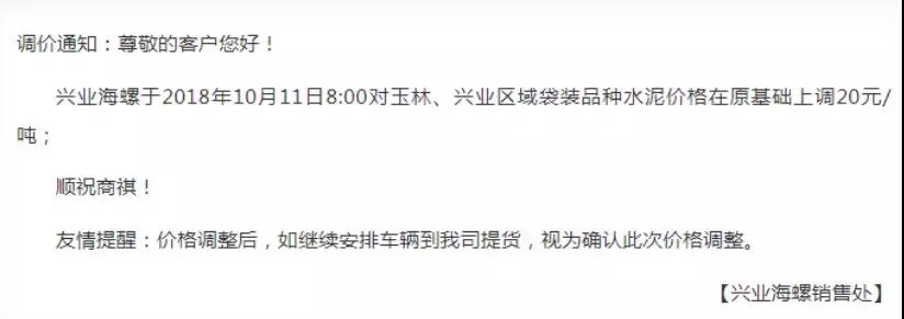 10月11日興業(yè)海螺、扶綏海螺、南寧紅獅、南寧華潤、貴港臺泥等企業(yè)統(tǒng)一發(fā)布漲價通知,漲價幅度20元/噸。