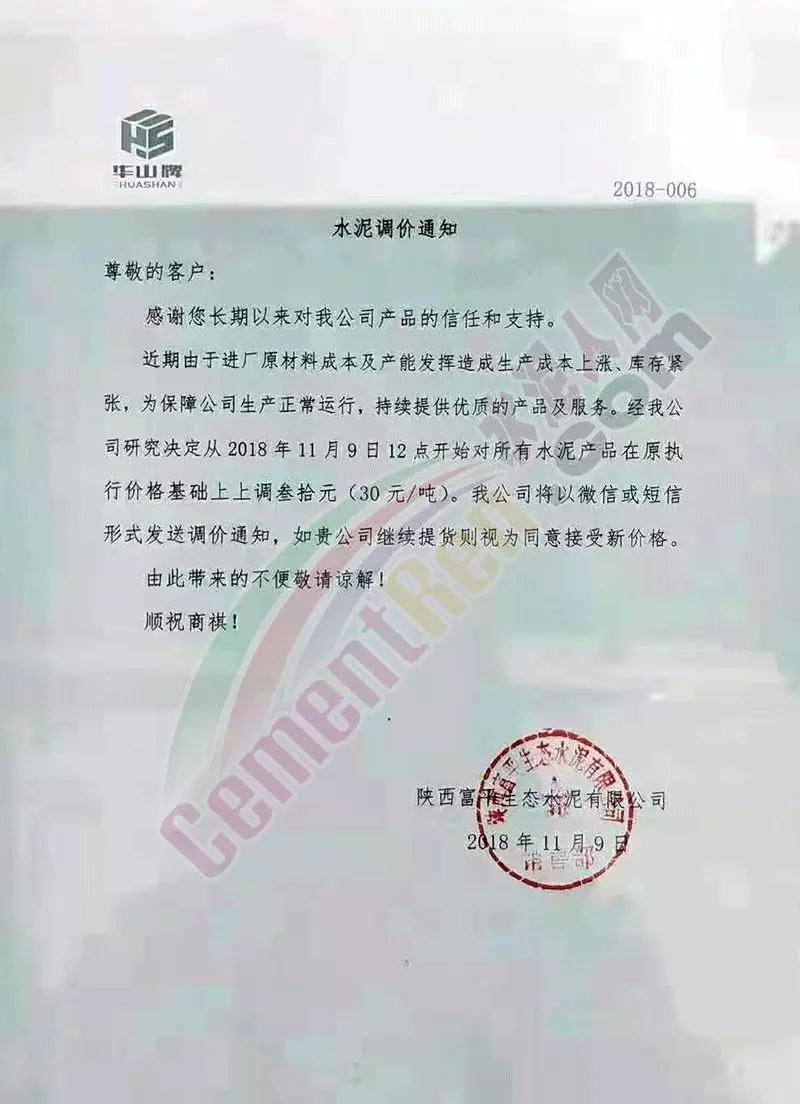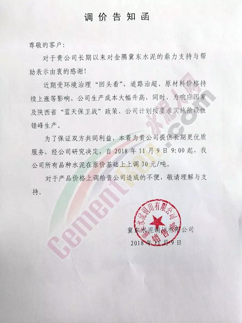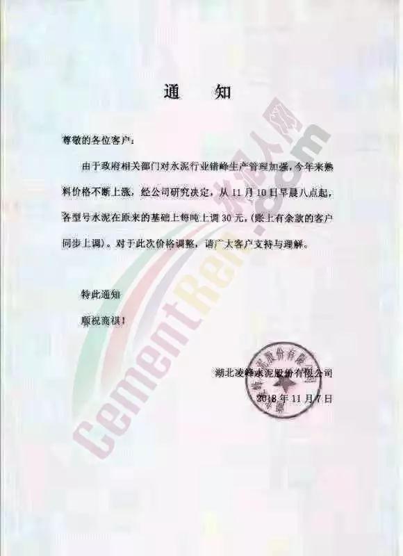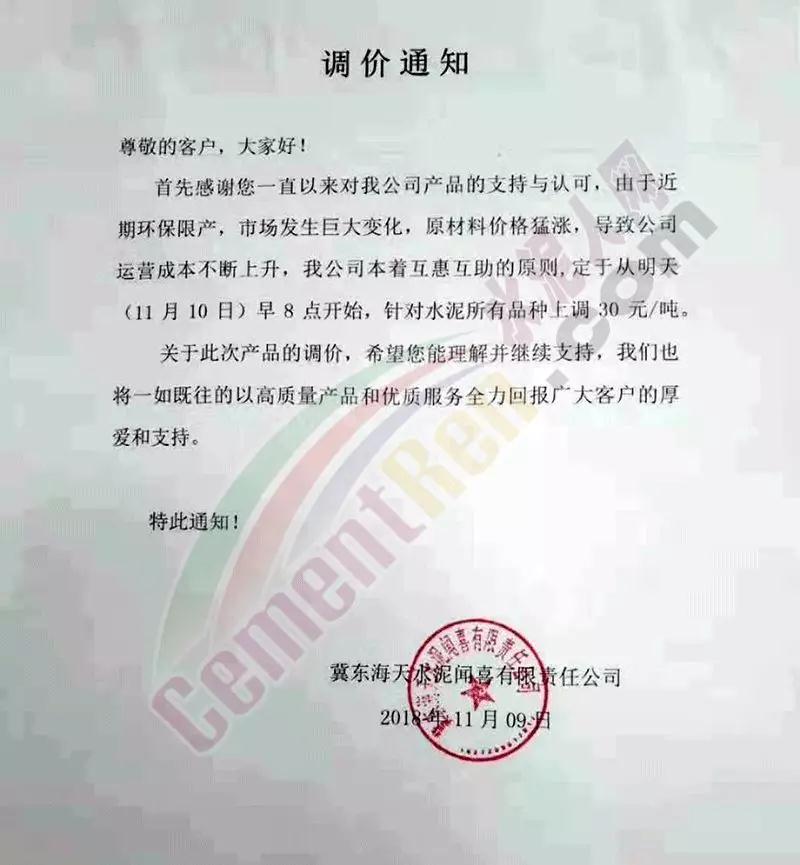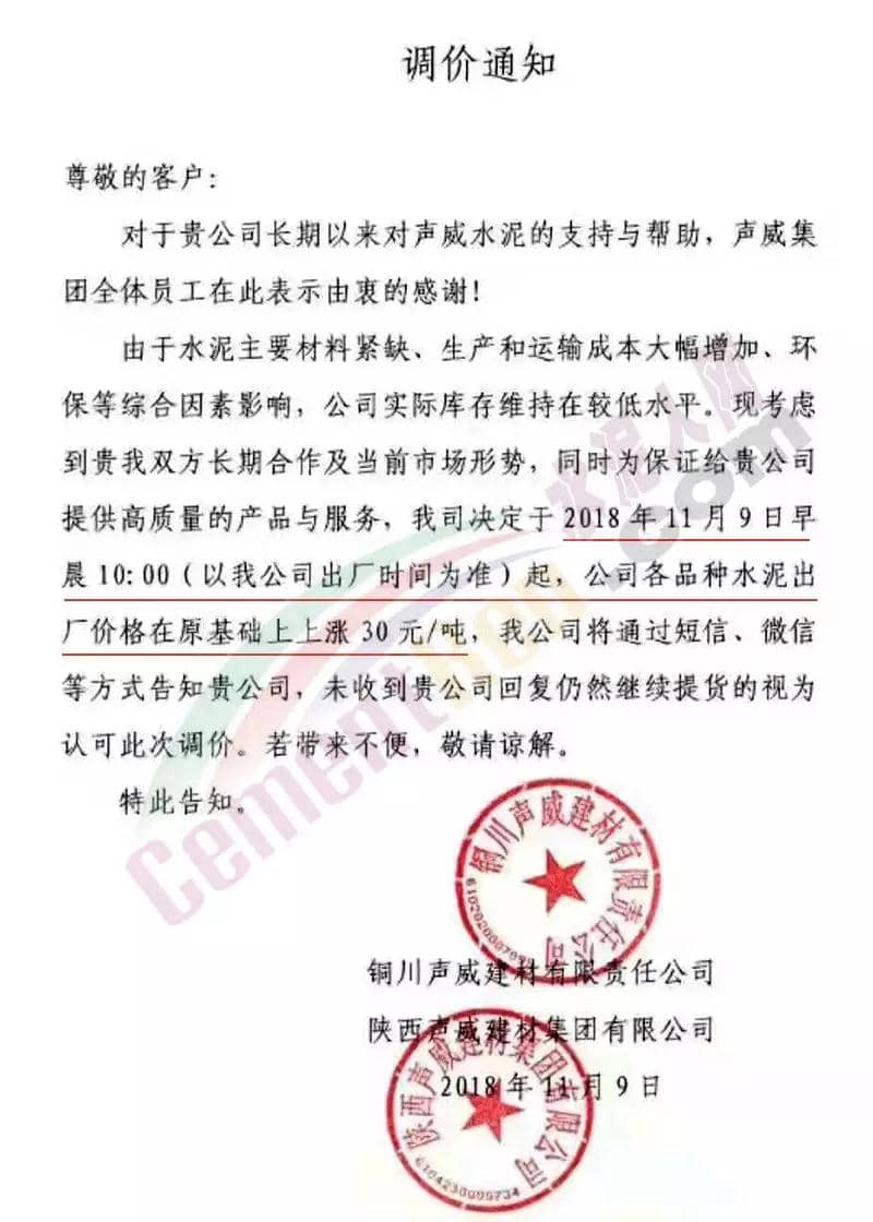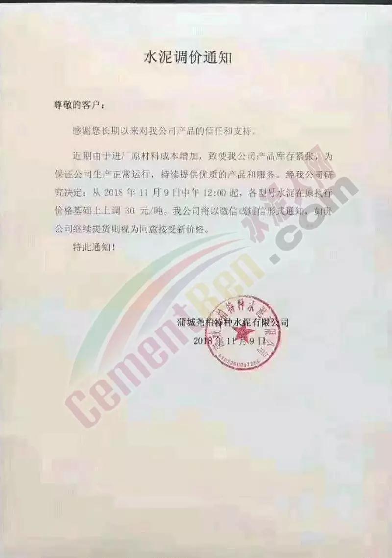 通過市場調(diào)研,結(jié)合本公司水泥生產(chǎn)成本,經(jīng)公司研究決定,從2018年11月10日零點起,我公司對銷往本區(qū)域各種型號散裝、袋裝水泥,在現(xiàn)行價格基礎(chǔ)上上調(diào)30元/噸。