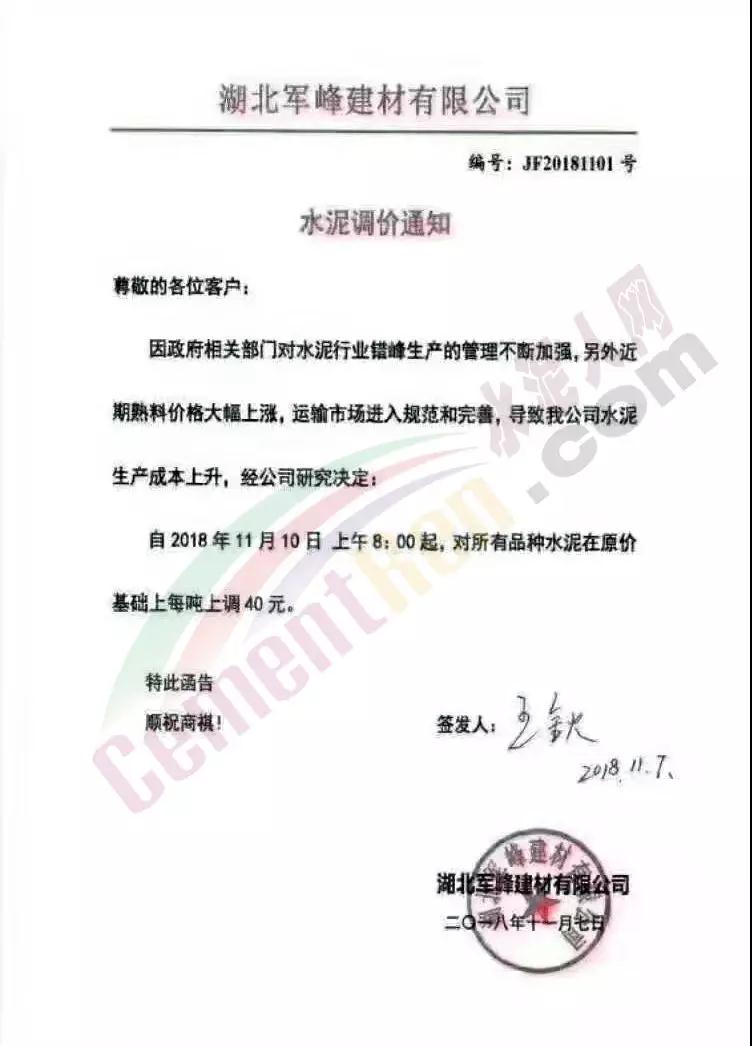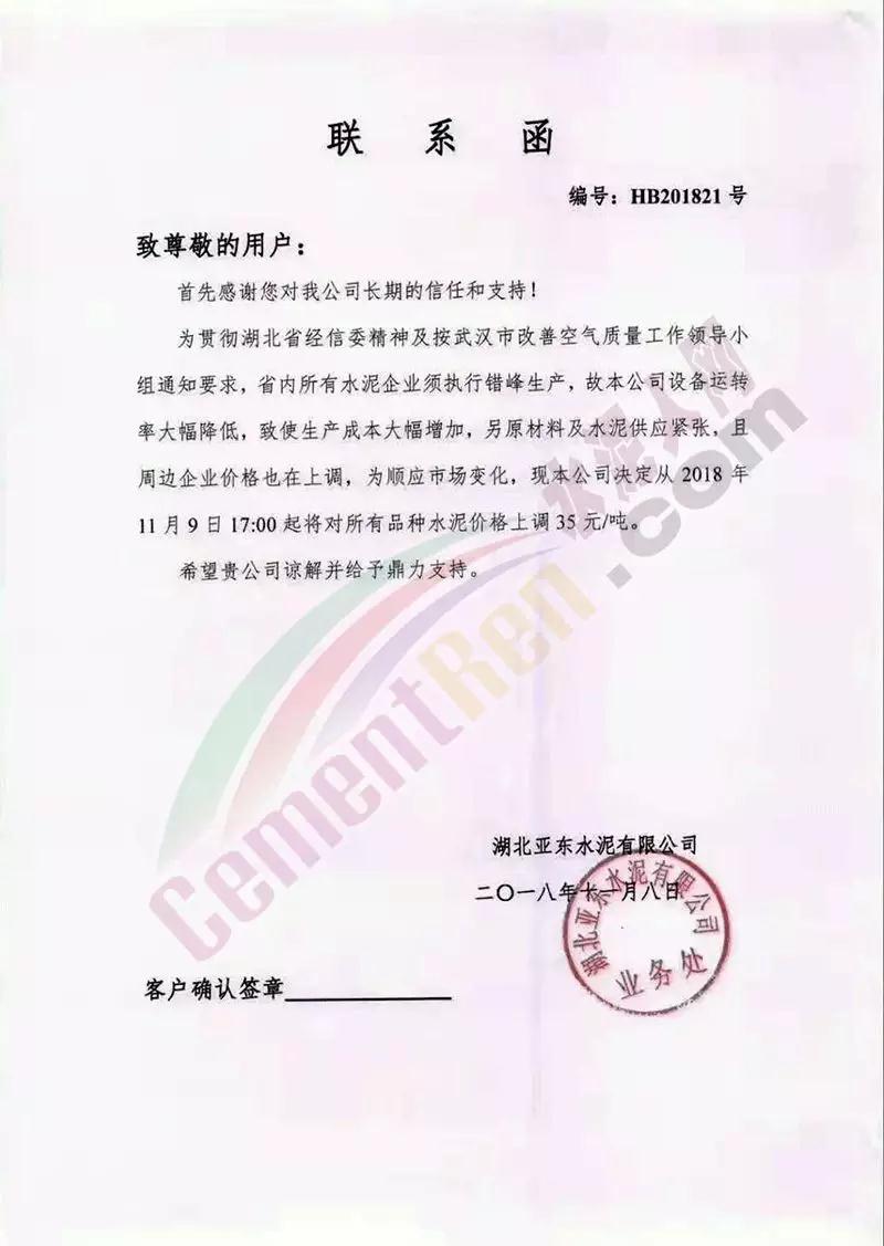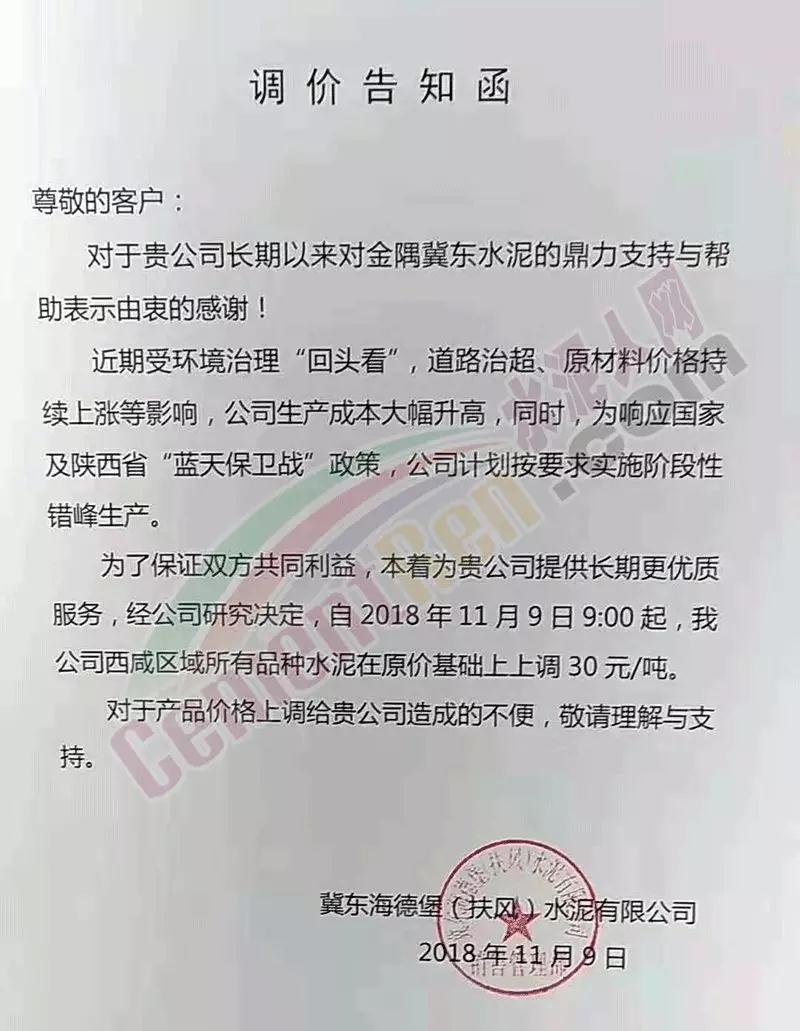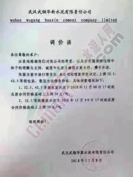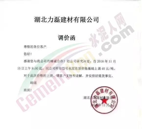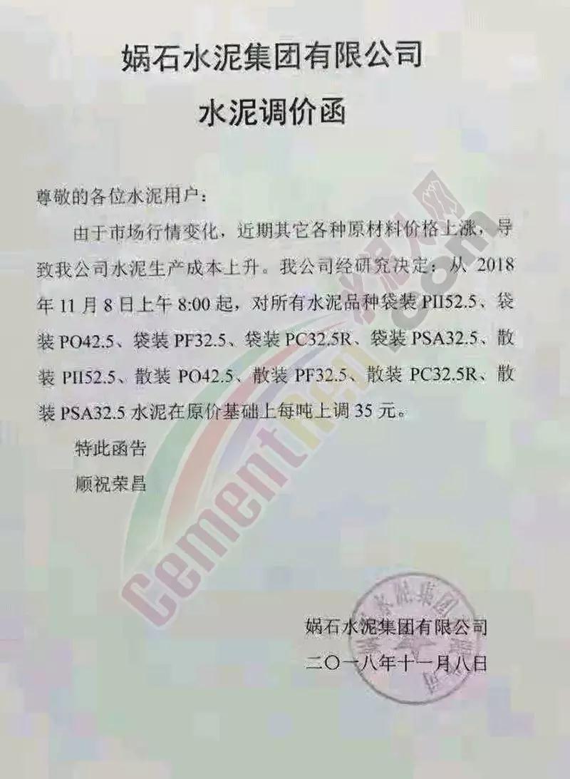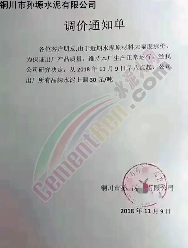 通過市場調(diào)研,結(jié)合本公司水泥生產(chǎn)成本,經(jīng)公司研究決定,從2018年11月10日零點起,我公司對銷往本區(qū)域各種型號散裝、袋裝水泥,在現(xiàn)行價格基礎(chǔ)上上調(diào)30元/噸。
