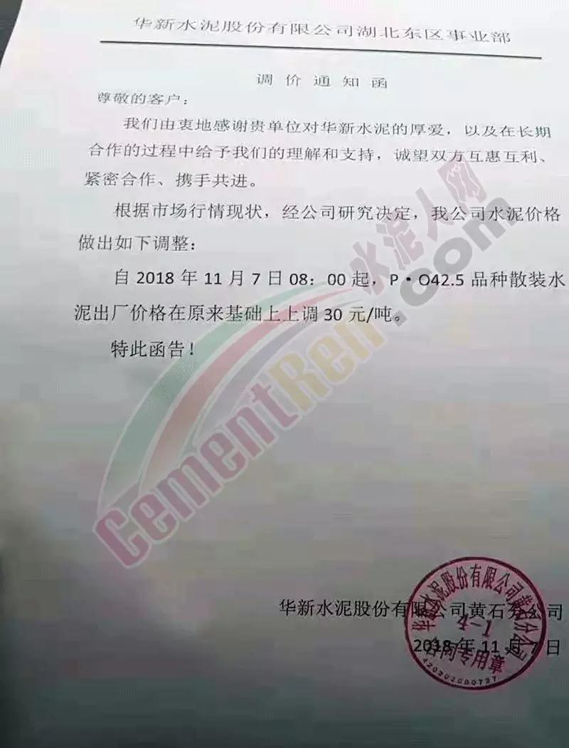 感謝您一直以來對我司的大力支持, 根據(jù)目前市場行情,經(jīng)公司研究決定,自2018年11月10日零時起,我司發(fā)往各區(qū)域的全部品牌規(guī)格袋裝水泥,散裝水泥的出廠價格在原來的價格基礎(chǔ)上上調(diào)30元/噸。