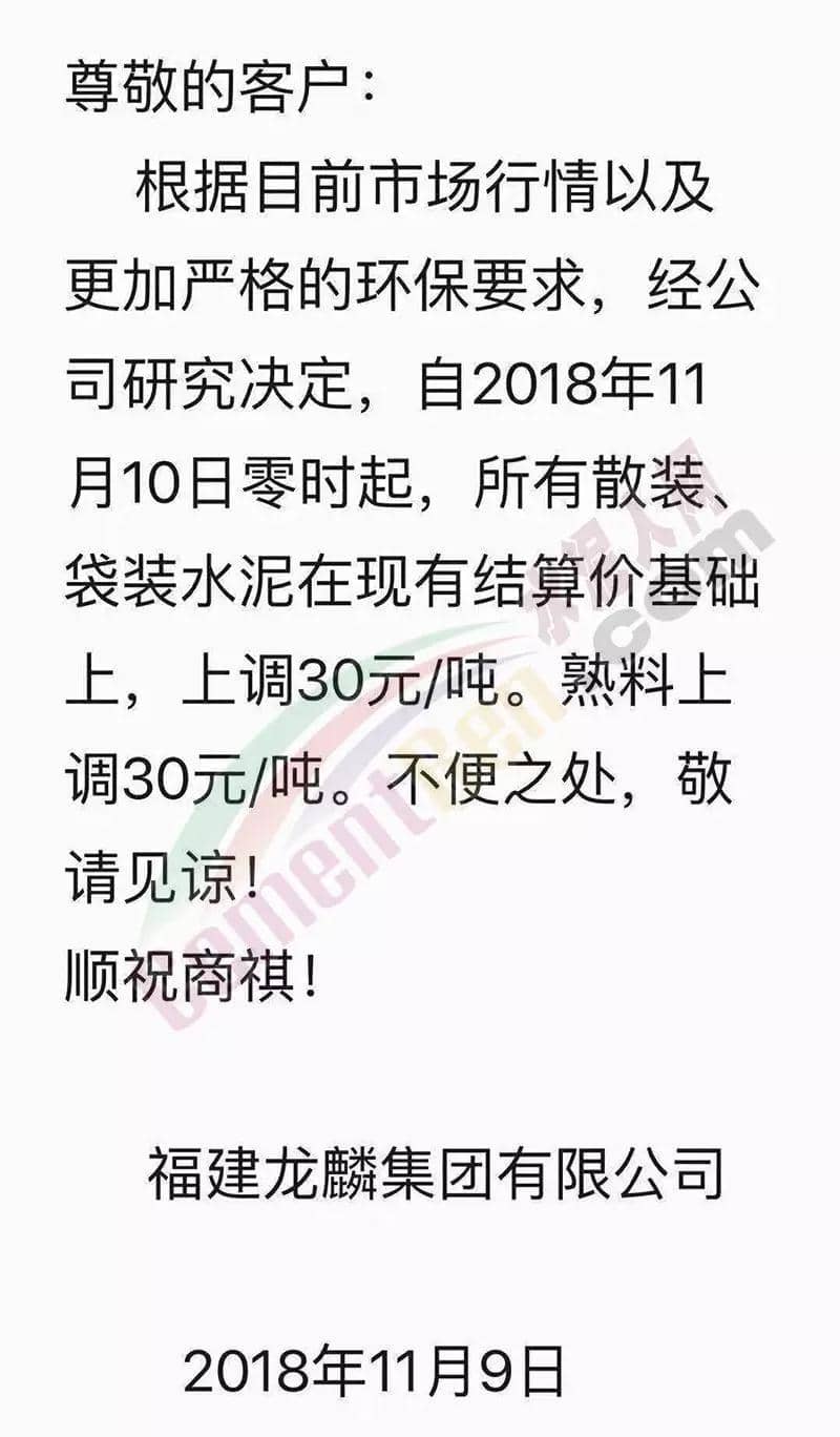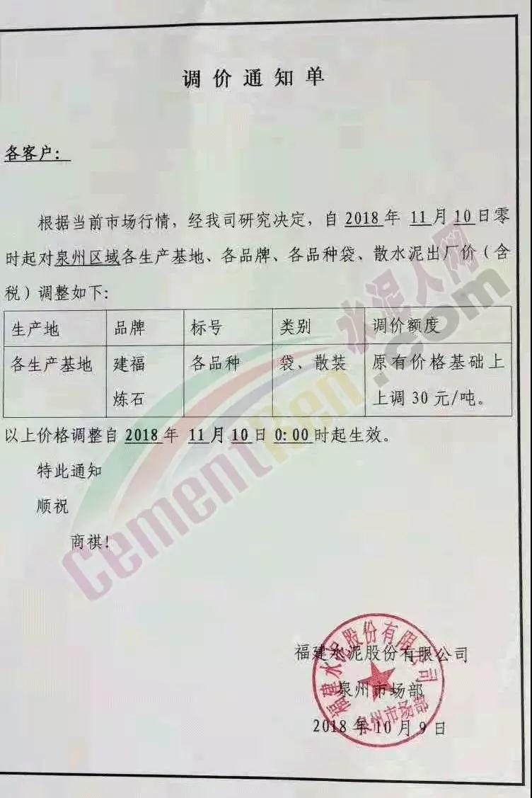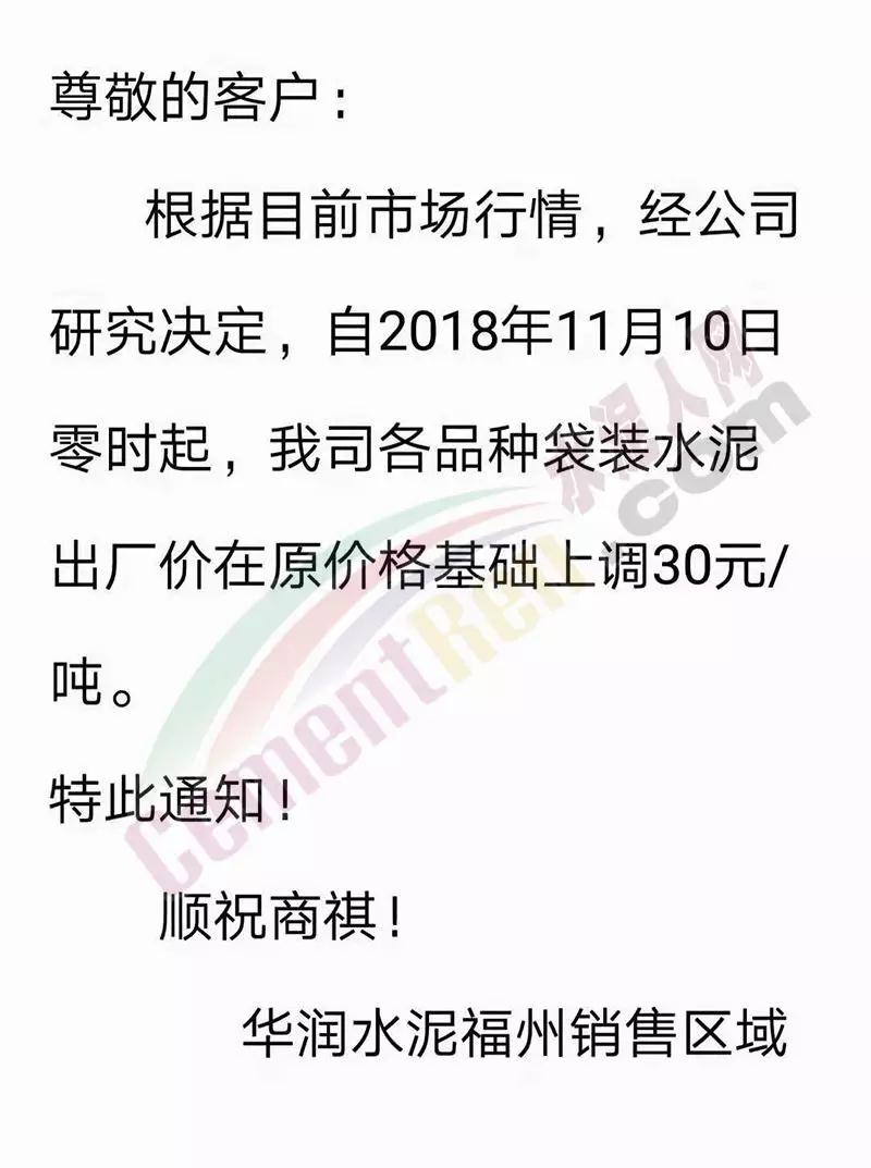 感謝您一直以來對我司的大力支持, 根據(jù)目前市場行情,經(jīng)公司研究決定,自2018年11月10日零時起,我司發(fā)往福建省內(nèi)各區(qū)域的袋裝、散裝水泥的出廠價格在原來的價格基礎(chǔ)上上調(diào)30元/噸。