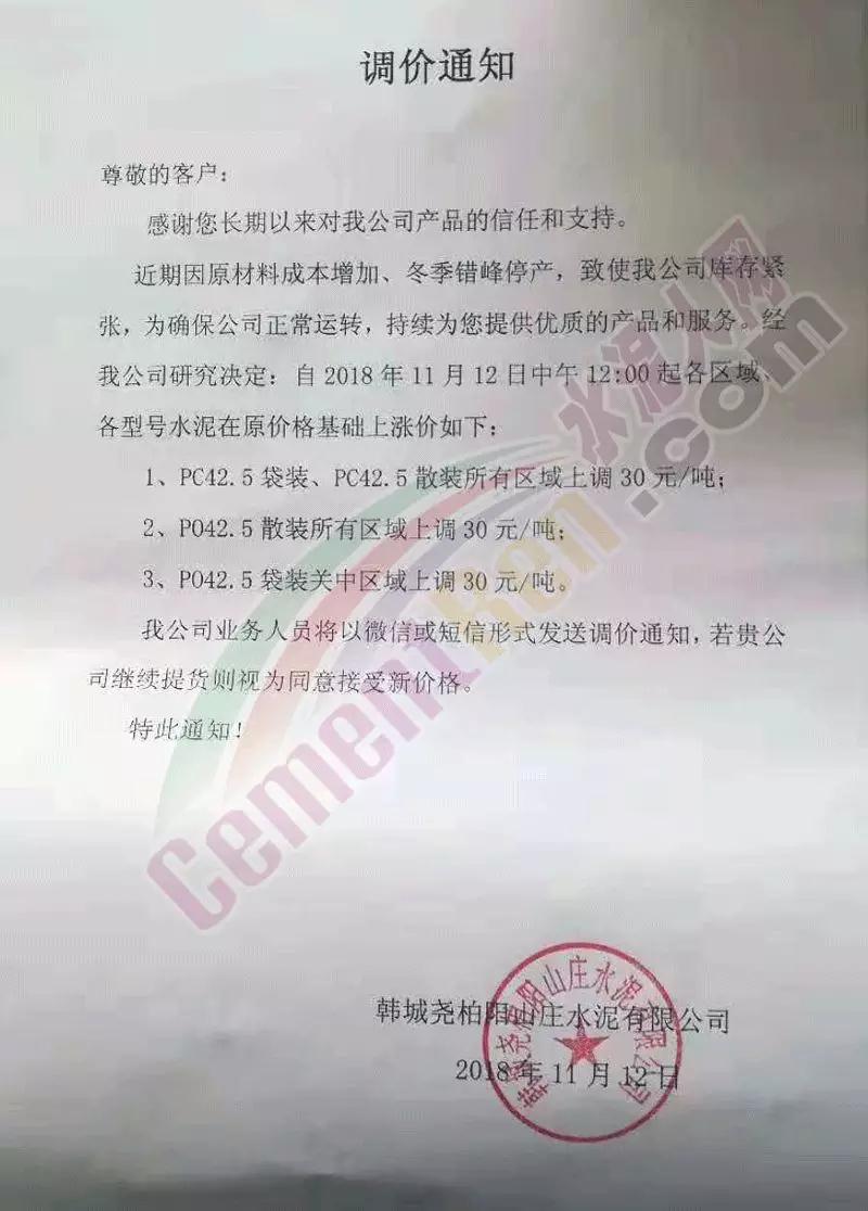 陜西關(guān)中區(qū)域近兩個(gè)月來已經(jīng)四輪上漲,水泥價(jià)格累計(jì)上漲了140元/噸,關(guān)中區(qū)域主導(dǎo)品牌多有排隊(duì)現(xiàn)象,且全部限量供應(yīng)。昨日(12日)中午12時(shí),韓城堯柏陽山莊水泥有限公司再次上調(diào)水泥價(jià)格,調(diào)價(jià)通知稱因原材料成本增加,冬季錯(cuò)峰停產(chǎn),致使公司庫存緊張,為確保公司正常運(yùn)轉(zhuǎn),持續(xù)為客戶提供優(yōu)質(zhì)的產(chǎn)品和服務(wù),經(jīng)公司研究決定上調(diào)各區(qū)域,各型號(hào)水泥價(jià)格。