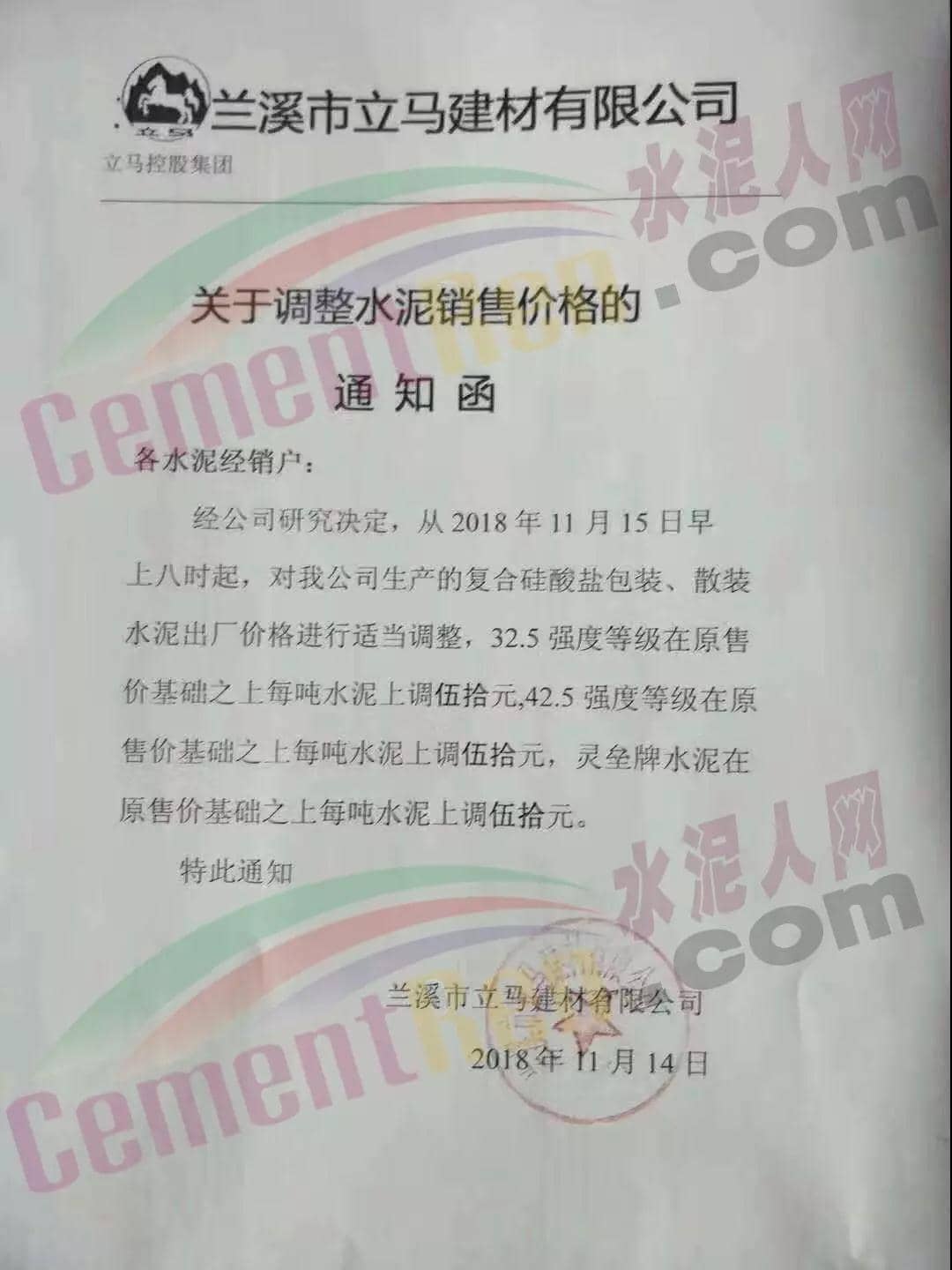 蘭溪市立馬建材有限公司發(fā)布通知稱,從2018年11月15日早上8:00時(shí)起,對公司生產(chǎn)的復(fù)合硅酸鹽包裝、散裝水泥出廠價(jià)格進(jìn)行適當(dāng)調(diào)整,32.5強(qiáng)度等級在原售價(jià)基礎(chǔ)上每噸水泥上調(diào)50元,42.5在原售價(jià)基礎(chǔ)上每噸水泥上調(diào)50元,靈壘牌水泥在原售價(jià)基礎(chǔ)上上調(diào)50元/噸。