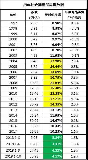 歷年社會消費品零售數據顯示額度方面也有所下降,絕對值增幅今年較前幾年有所下降。年度商品零售物價指數較前五年有所上漲, 詳情見下表: