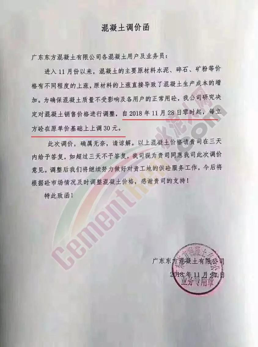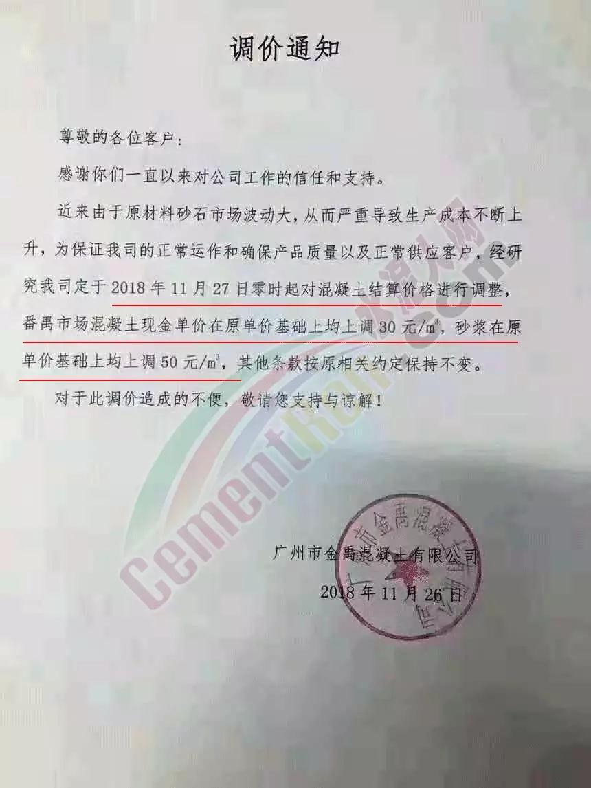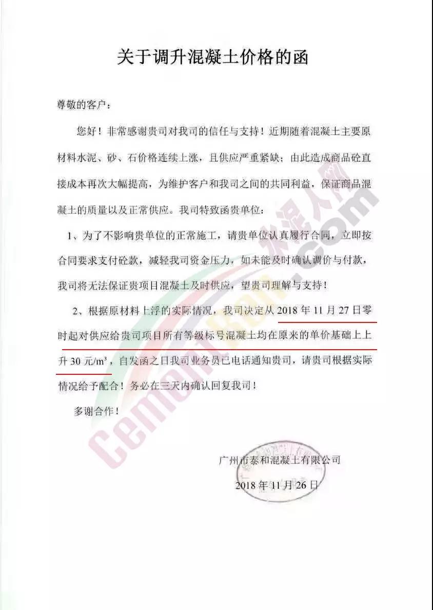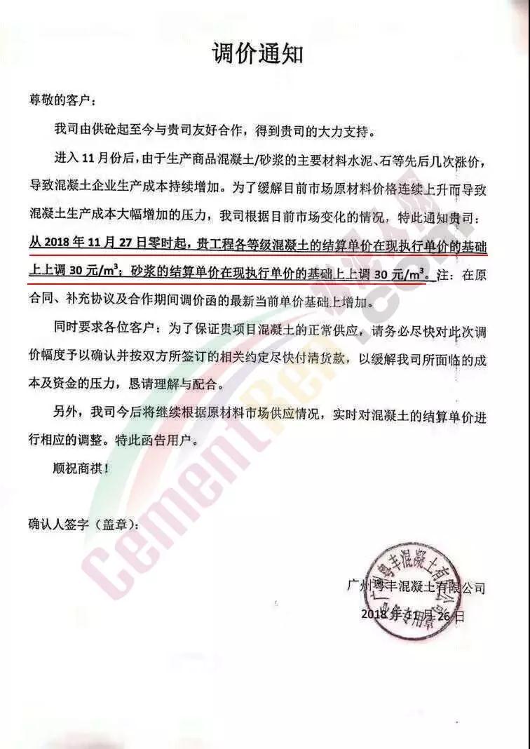 為了緩解目前市場原材料價格連續(xù)上升而導致混凝土生產(chǎn)成本大幅增加的壓力,根據(jù)目前市場變化,從即日起,各等級混凝土結(jié)算單價在現(xiàn)執(zhí)行單價的基礎上上調(diào) 30元/立方米;砂漿的結(jié)算單價在現(xiàn)執(zhí)行單價的基礎上上調(diào)30-50元/立方米。