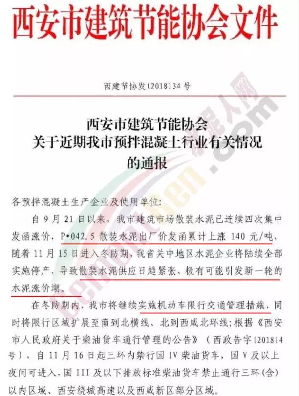 與此行情類似的是關中區(qū)域。日前,西安市建筑節(jié)能協(xié)會發(fā)布《關于預拌混凝土行業(yè)有關情況的通報》,通報稱自9月21日以來,西安市建筑市場散裝水泥已連續(xù)四次集中漲價,累計漲幅達140元/噸。隨著11月15日進入冬防期,陜西省關中地區(qū)水泥企業(yè)將陸續(xù)全部實施停產(chǎn),導致散裝水泥供應日趨緊張,極有可能引發(fā)新一輪的水泥漲價潮。目前,關中地區(qū)不僅僅是窯企停限產(chǎn),水泥供應日趨緊張。在冬防期內(nèi)西安市繼續(xù)實施機動車限行交通管理措施,同時限行區(qū)域擴大。