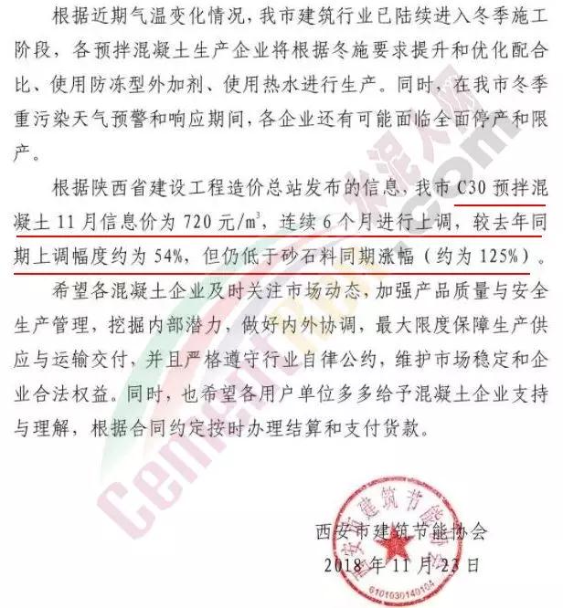 據(jù)了解,根據(jù)陜西省建設工程造價總站發(fā)布的信息,西安C30預拌混凝土11月信息價為720元/立方米,且已經(jīng)連續(xù)6個月進行上調(diào),較上年同期上調(diào)54%,但仍低于砂石料同期漲幅,砂石料同期漲幅約為125%。西安市建筑節(jié)能協(xié)會提到希望各混凝土企業(yè)及時關注市場動態(tài)。
