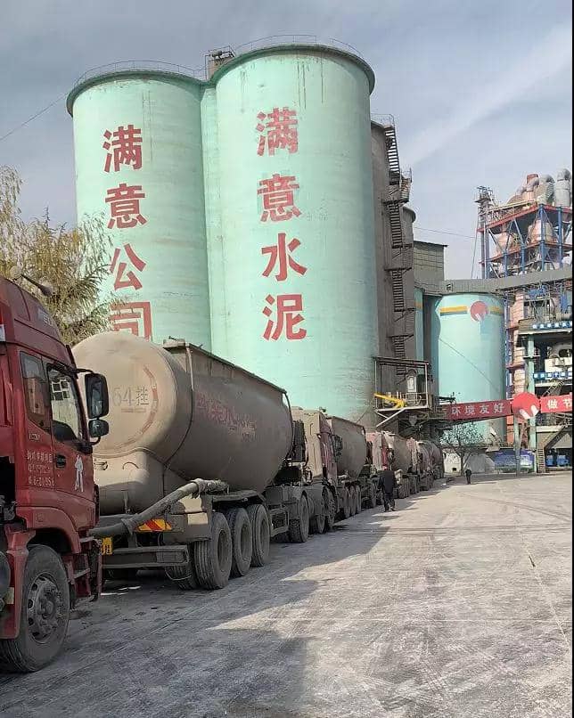 門前排隊車輛有條不紊進入工廠灌裝水泥