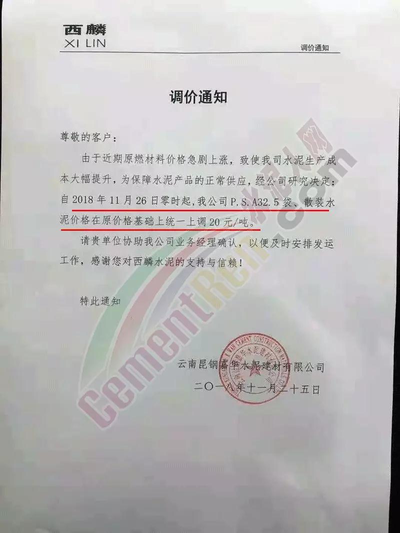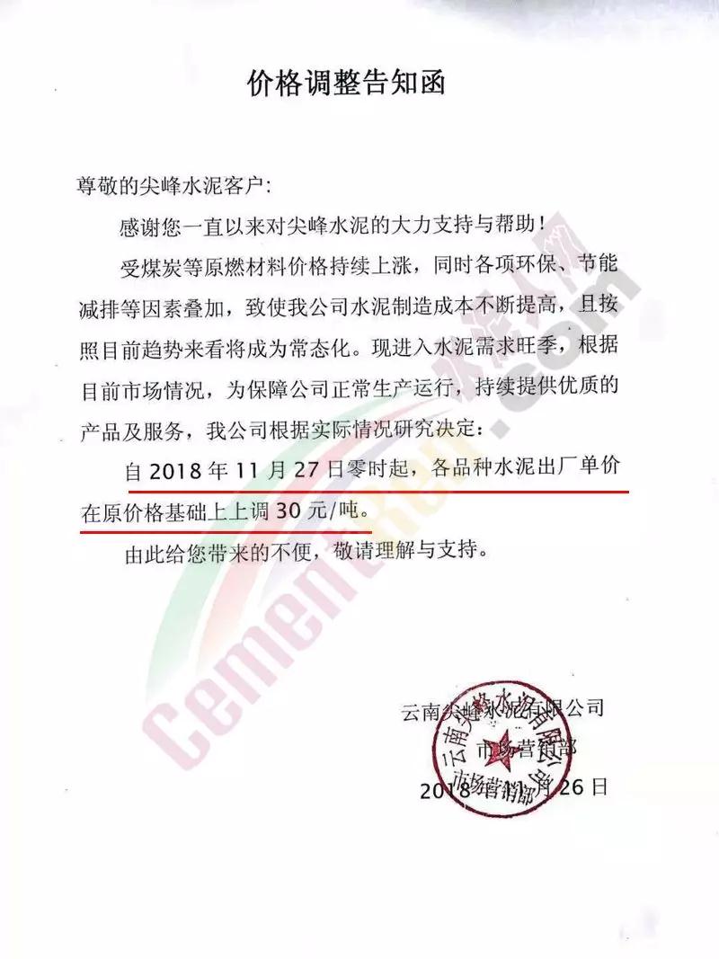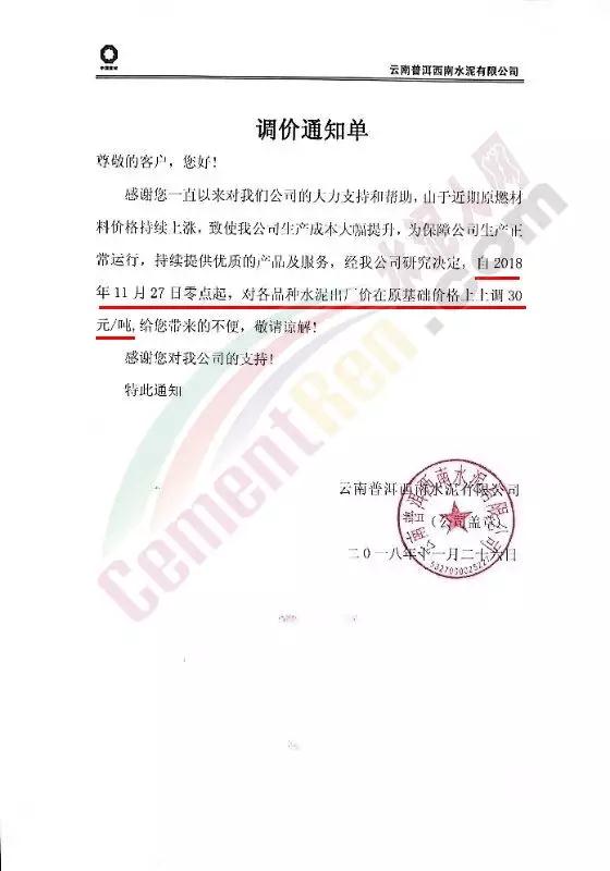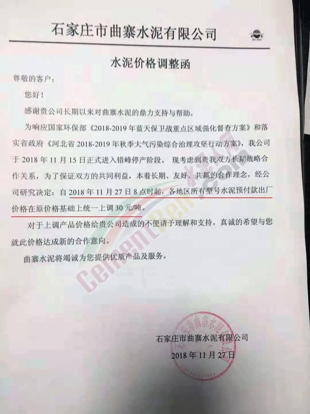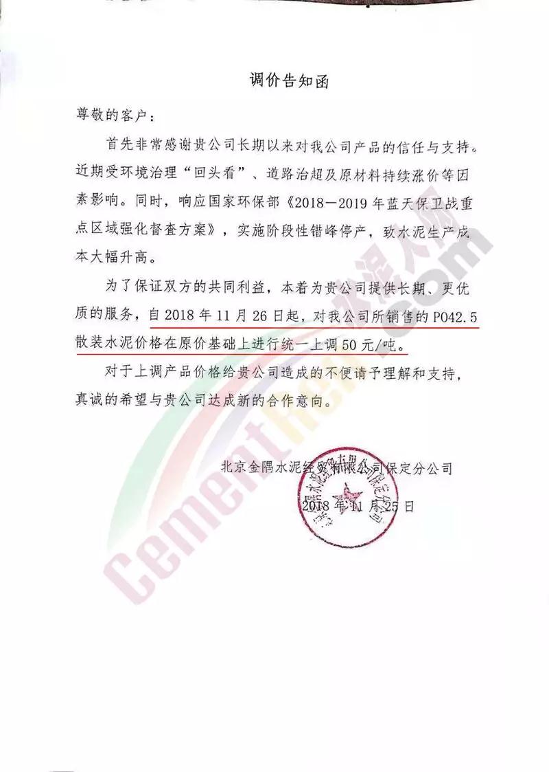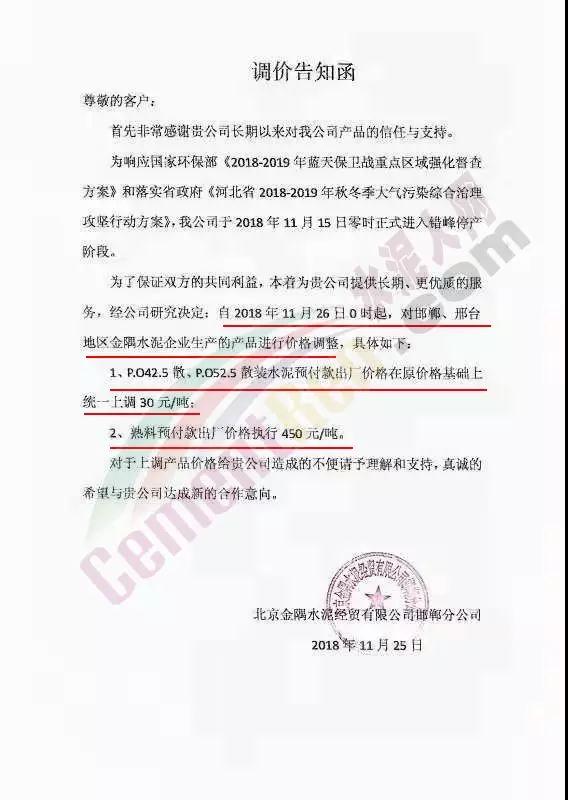 近兩日京津冀地區(qū)又迎來一波漲價潮。區(qū)域主導企業(yè)金隅水泥經(jīng)貿(mào)公司石家莊、邯鄲、保定等公司陸續(xù)發(fā)布了調(diào)價通知。石家莊區(qū)域京蘭水泥、曲寨水泥等主要品牌亦同期發(fā)通知上調(diào)水泥價格。調(diào)價函如下: