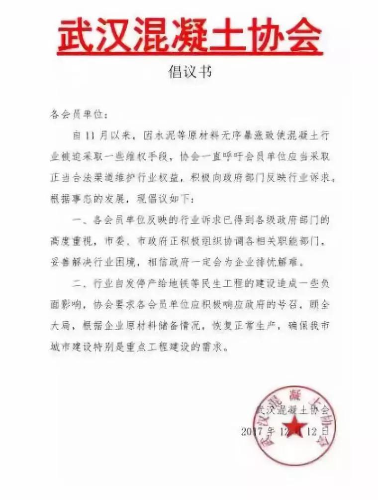同期湖北武漢混凝土協(xié)會(huì)發(fā)出倡議書稱,因水泥等原材料無序暴漲致使混凝土行業(yè)采取一些維權(quán)手段,武漢混凝土協(xié)會(huì)一直呼吁會(huì)員單位應(yīng)當(dāng)采取正當(dāng)合法渠道維護(hù)行業(yè)權(quán)益,積極向政府部門反映行業(yè)訴求。