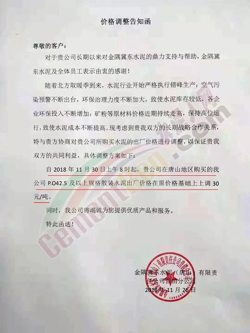 日前,華北地區(qū)主導(dǎo)企業(yè)金隅冀東水泥集中發(fā)布調(diào)價(jià)通知。其中,北京金隅經(jīng)貿(mào)有限公司調(diào)價(jià)通知稱,隨著環(huán)保治理力度不斷加大,各企業(yè)環(huán)保投入不斷增加,水泥行業(yè)開始嚴(yán)格執(zhí)行錯(cuò)峰生產(chǎn)。同時(shí),煤炭、礦粉等價(jià)格持續(xù)走高,導(dǎo)致水泥成本不斷提高。企業(yè)將于12月1日起上調(diào)各生產(chǎn)企業(yè)的所有水泥產(chǎn)品出廠價(jià)格,上調(diào)幅度30元/噸。