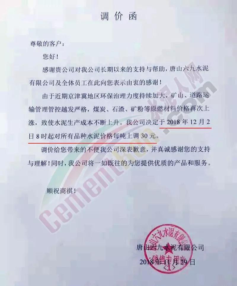 同期唐山燕東水泥,唐山泓泰水泥,六九水泥也跟隨發(fā)布了調(diào)價(jià)通知,稱自下月初起上調(diào)了水泥出廠價(jià)格,上調(diào)幅度30元/噸。