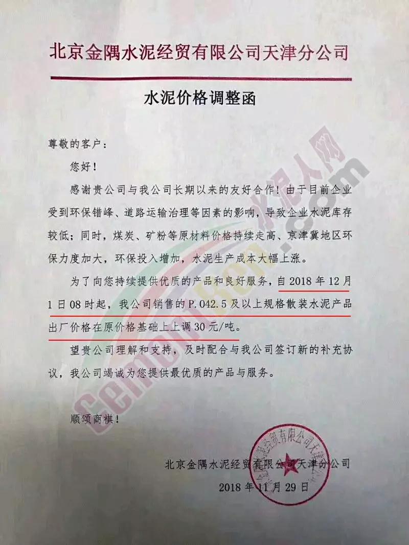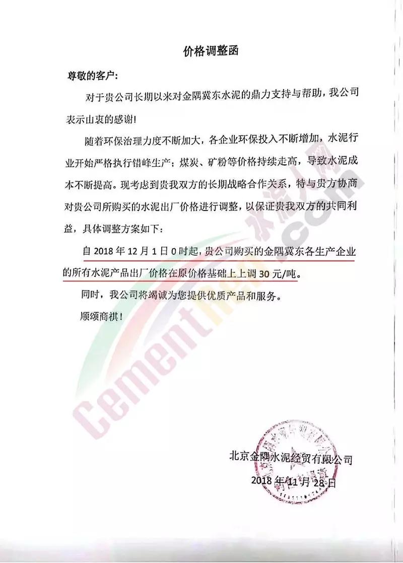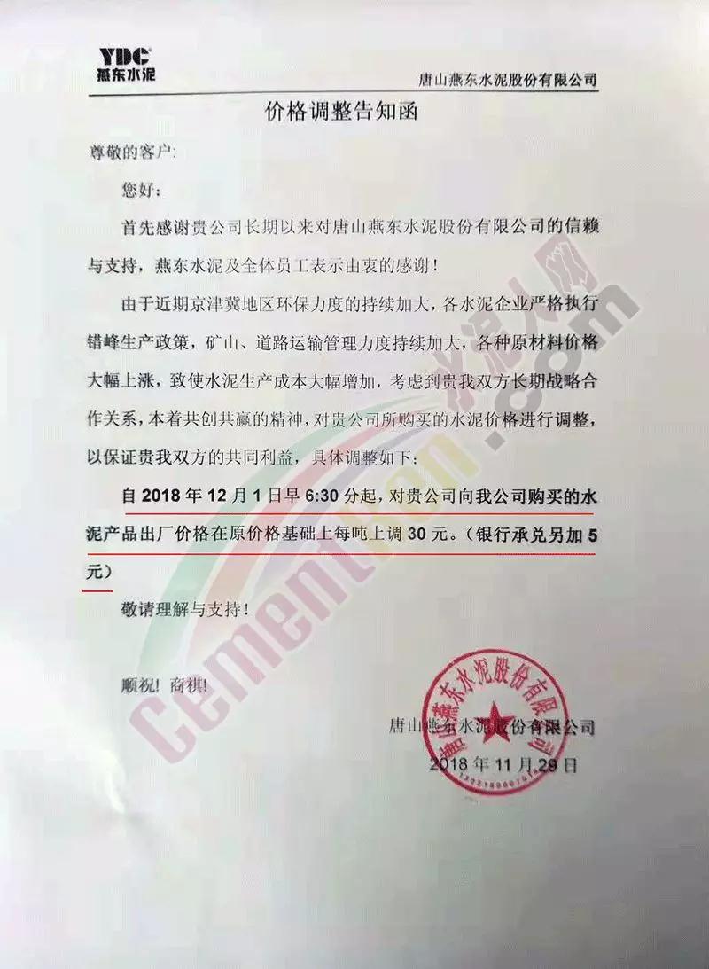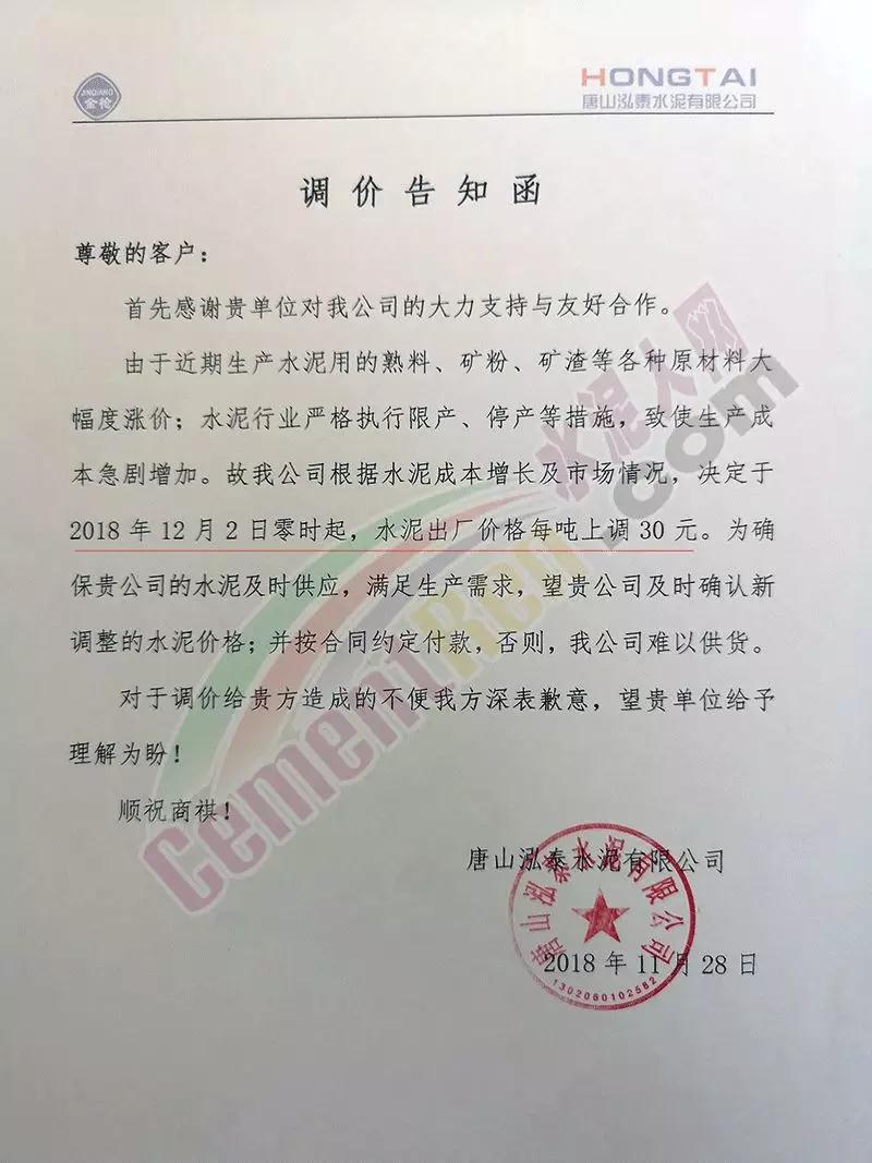 同期唐山燕東水泥,唐山泓泰水泥,六九水泥也跟隨發(fā)布了調(diào)價(jià)通知,稱(chēng)自即日起上調(diào)水泥出廠(chǎng)價(jià)格,上調(diào)幅度30元/噸。