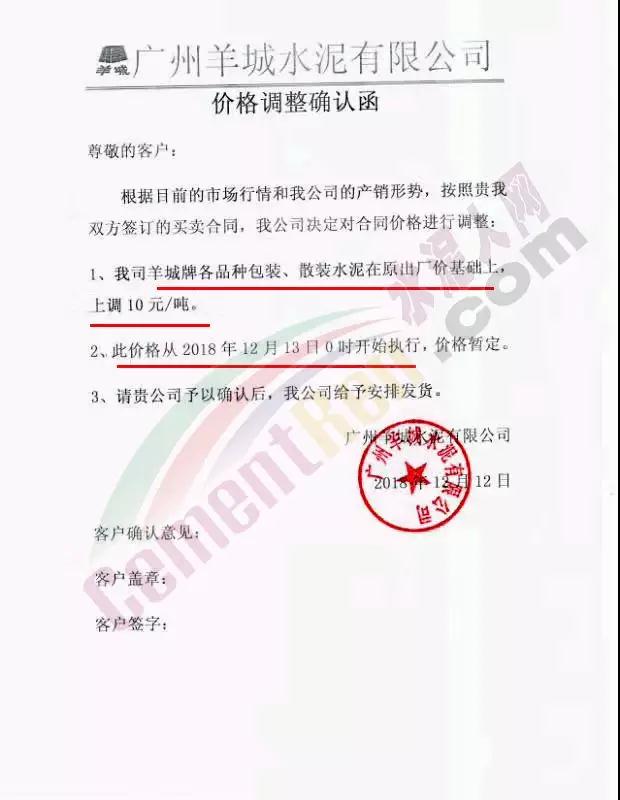 廣州羊城水泥有限公司價格調(diào)整確認函稱,根據(jù)目前的市場行情和公司的產(chǎn)銷形勢,公司決定對合同價格進行調(diào)整,自今日(12月13日)0時起公司羊城牌各品種包裝、散裝水泥在原出廠價基礎(chǔ)上上調(diào)10元/噸。