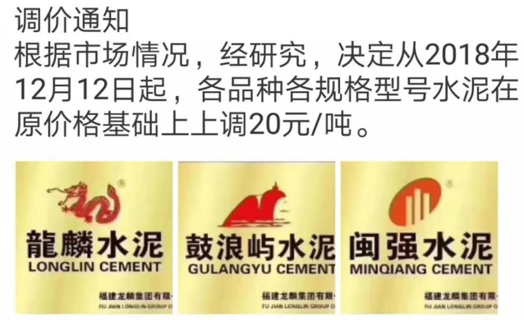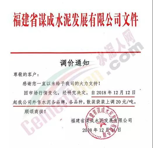 基于目前市場行情,結(jié)合我司實際情況,經(jīng)我公司研究決定,自2018年12月12日零時起,我公司發(fā)往福建省全區(qū)域的各品牌、品種袋裝、散裝水泥的出廠價格在原有基礎(chǔ)上上調(diào): 20元/噸。