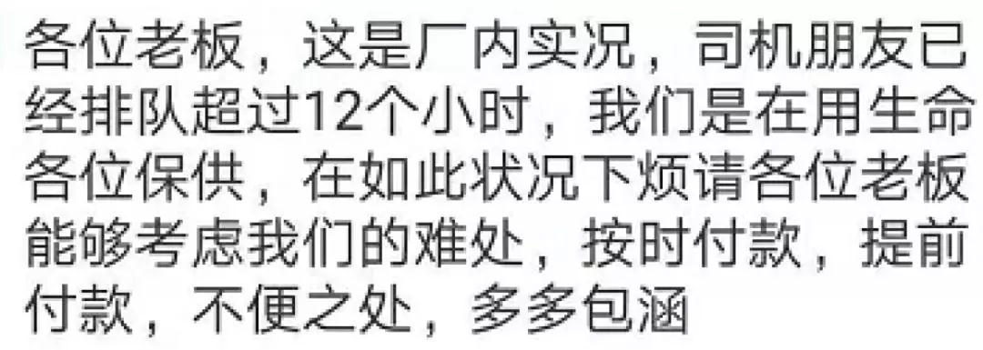 東北市場冰凍了,華南市場卻還是一片火熱。熱銷狀況未有絲毫減弱。經(jīng)銷商發(fā)消息提示下游客戶:司機排隊已經(jīng)超過12小時,經(jīng)銷商是用“命”在保供。希望經(jīng)銷商能按時付款、提前付款。