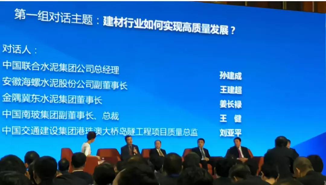 隨后,整個會議進行第一個議程,由中國聯(lián)合水泥集團公司總經(jīng)理孫建成、安徽海螺水泥股份公司副董事長王建超、金隅冀東水泥集團董事長姜長祿、中國南玻集團副董事長、總裁王健、中國交通建設(shè)集團港珠澳大橋島隧工程項目質(zhì)量總監(jiān)劉亞平就“如何實現(xiàn)建材行業(yè)高質(zhì)量發(fā)展”展開激烈的討論。