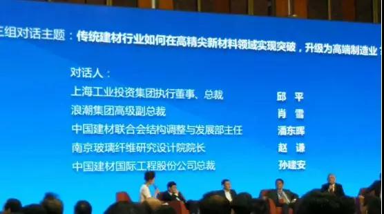 上海工業(yè)投資(集團)有限公司執(zhí)行董事、總裁邱平,浪潮集團高級副總裁、中國檢驗檢測學(xué)會質(zhì)量鏈工作委員會主任肖雪、中材高新材料股份有限公司總裁張偉儒、南京玻纖院董事長趙謙、蚌埠玻璃工業(yè)設(shè)計研究院常務(wù)副院長馬立云就“傳統(tǒng)建材如何在高精尖新材料領(lǐng)域?qū)崿F(xiàn)突破,推動建材行業(yè)升級為高端制造業(yè)”交換了意見。