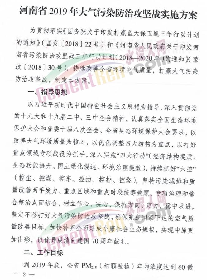 近日,河南省污染防治攻堅(jiān)戰(zhàn)領(lǐng)導(dǎo)小組辦公室發(fā)布《關(guān)于印發(fā)河南省2019年大氣污染防治攻堅(jiān)戰(zhàn)實(shí)施方案的通知》,該文件對(duì)于河南省水泥行業(yè)錯(cuò)峰生產(chǎn)及環(huán)保治理提出了史上最嚴(yán)的要求。