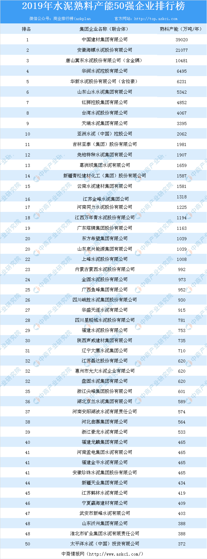 據(jù)數(shù)據(jù)統(tǒng)計(jì)顯示:前10家大企業(yè)集團(tuán)的水泥熟料年產(chǎn)能達(dá)到10.3億噸,占全國(guó)總產(chǎn)能的57%,與上年相比保持持平。以下是2019年全國(guó)水泥熟料產(chǎn)能50強(qiáng)企業(yè)詳細(xì)排名情況: