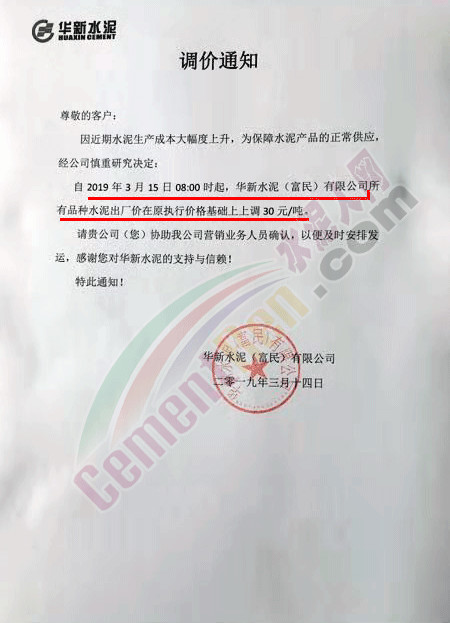 華新水泥(富民)有限公司調(diào)價(jià)通知稱(chēng),因近期水泥生產(chǎn)成本大幅度上升,為保障水泥產(chǎn)品的正常供應(yīng),自2019年3月15日8時(shí)起,所有品種水泥出廠價(jià)在原執(zhí)行價(jià)格基礎(chǔ)上上調(diào)30元/噸。