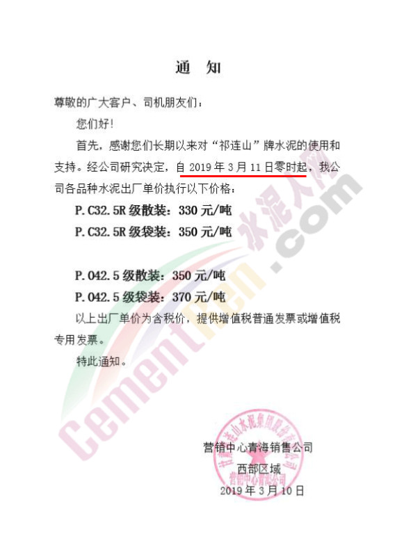 感謝您一直以來(lái)對(duì)冷水江華新水泥的支持信任,根據(jù)當(dāng)前市場(chǎng)變化情況,經(jīng)公司研究決定:自2019年3月16日08時(shí)起,對(duì)華新水泥產(chǎn)品價(jià)格進(jìn)行如下調(diào)整:P.O42.5散裝水泥在原價(jià)格基礎(chǔ)上上調(diào)20元/噸。