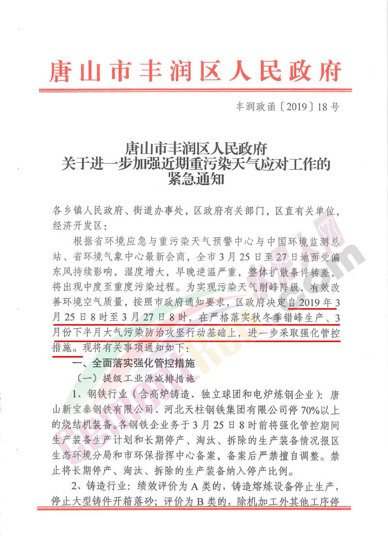 河北省唐山市,這個(gè)京津冀地區(qū)的“水泥窩”,一遇到重污染天氣就發(fā)布緊急通知。昨日(3月25日),唐山市豐潤(rùn)區(qū)人民政府發(fā)布豐潤(rùn)政函【2019】18號(hào)文件《關(guān)于進(jìn)一步加強(qiáng)近期重污染天氣應(yīng)對(duì)工作的緊急通知》要求自3月25日至3月27日,在嚴(yán)格落實(shí)秋冬季錯(cuò)峰生產(chǎn),3月份下半月大氣污染攻堅(jiān)行動(dòng)基礎(chǔ)上,進(jìn)一步采取強(qiáng)化管控措施。