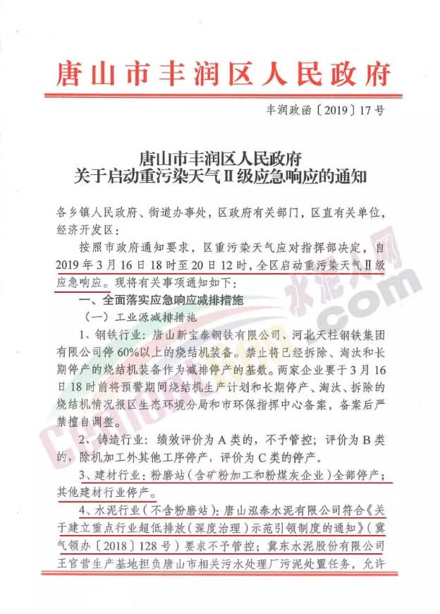 上個(gè)月底,2月28日唐山市人民政府曾發(fā)布《關(guān)于啟動(dòng)重污染天氣Ⅰ級(jí)應(yīng)急響應(yīng)的通知》要求建材行業(yè)。粉磨站停產(chǎn);水泥行業(yè)(不含粉磨站)。符合《關(guān)于建立重點(diǎn)行業(yè)超低排放(深度治理)示范引領(lǐng)制度的通知》(冀氣領(lǐng)辦〔2018〕128號(hào))要求的,不予管控;協(xié)同處置城市垃圾(含污泥)或危險(xiǎn)廢物等保民生任務(wù)的,可根據(jù)承擔(dān)任務(wù)量核定最大允許生產(chǎn)負(fù)荷生產(chǎn);承擔(dān)居民供暖的,根據(jù)承擔(dān)任務(wù)量核定最大允許生產(chǎn)負(fù)荷生產(chǎn)。其他企業(yè)停產(chǎn)。