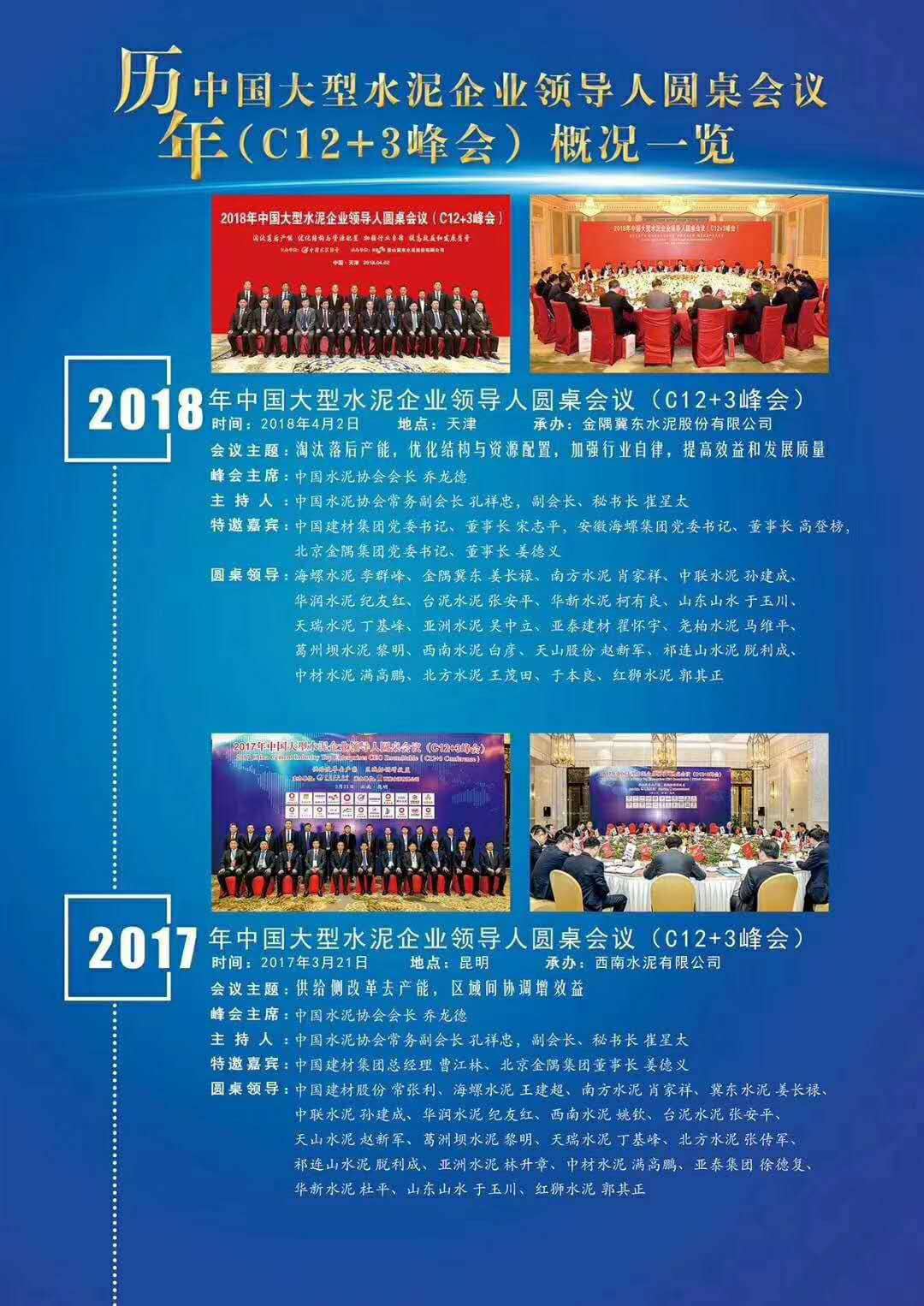 據(jù)水泥人網(wǎng)了解,中國(guó)大型水泥企業(yè)領(lǐng)導(dǎo)人圓桌會(huì)議(C12+3峰會(huì))自2012年以來(lái)每年一屆,通常在每年的三月或四月份召開。