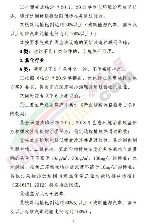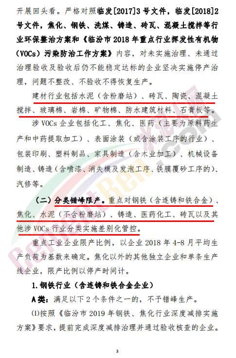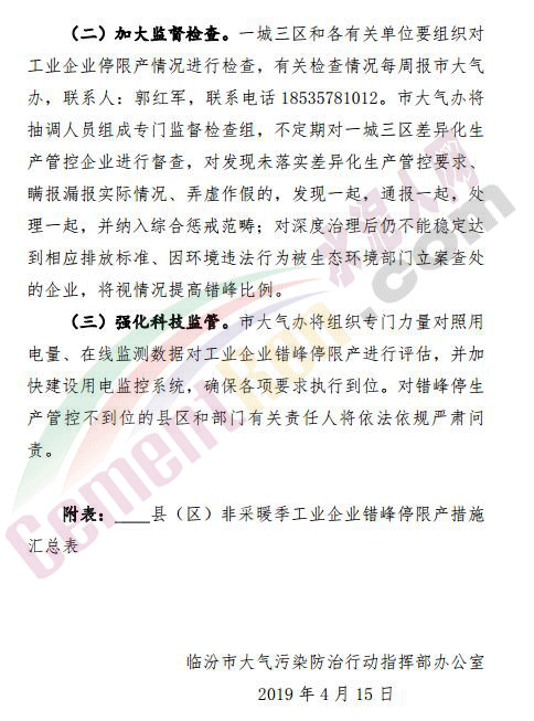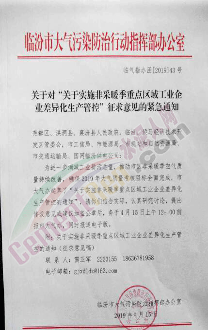 日前,山西臨汾市下達(dá)非采暖季重點(diǎn)區(qū)域差異化生產(chǎn)管控的通知,從2019年4月15日起,到2019年9月30日止,對(duì)一城三區(qū)(堯都區(qū)、襄汾縣、洪洞縣,臨汾開(kāi)發(fā)區(qū))相關(guān)企業(yè)實(shí)施差異化生產(chǎn)管控。嚴(yán)格對(duì)照臨發(fā)[2017]3號(hào)文件, 臨發(fā)[2018]2號(hào)文件,焦化、鋼鐵、洗煤、鑄造、磚瓦、混凝土攪拌等行業(yè)環(huán)保整治方案和《臨汾市2018年重點(diǎn)行業(yè)揮發(fā)性有機(jī)物(VOCs)污染防治工作方案》。重點(diǎn)對(duì)鋼鐵(含連鑄和鐵合金)、焦化、水泥(不含粉磨站)、鑄造其他涉VOCs行業(yè)分類實(shí)施差別化管控。