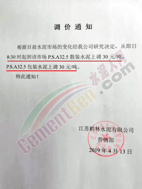 尊敬的客戶:您好!根據(jù)當(dāng)前市場(chǎng)行情,我公司于2019年4月13日8:00,對(duì)各品種水泥價(jià)格上調(diào)30元/噸。特此通知!