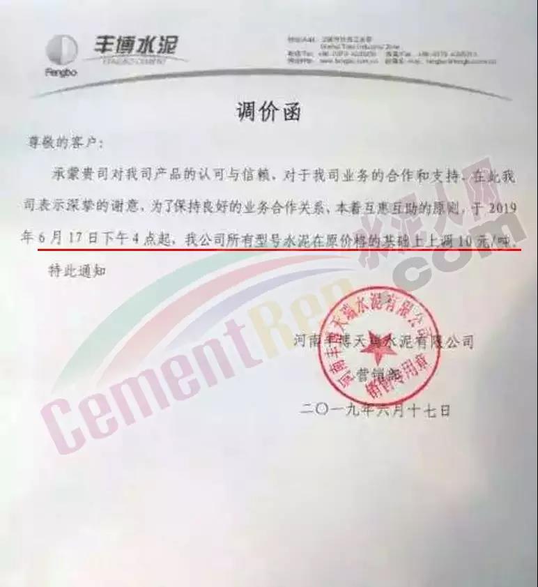 與此同時,河南部分企業(yè)發(fā)布了調(diào)價通知,其中河南豐博天瑞水泥有限公司發(fā)布調(diào)價函稱于17日下午4點起, 公司所有型號水泥價格在原價基礎(chǔ)上上調(diào)10元/噸。