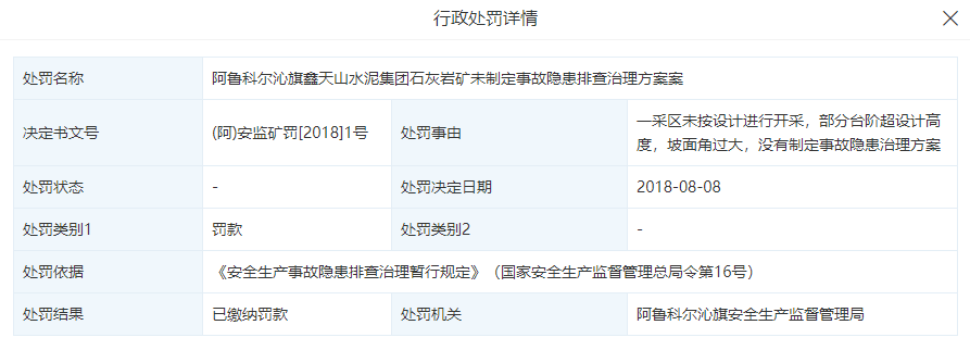 2017年8月4日,阿旗安監(jiān)局曾針對(duì)企業(yè)未如實(shí)記錄安全生產(chǎn)教育和培訓(xùn)情況做出行政罰,罰款一萬元人民幣。