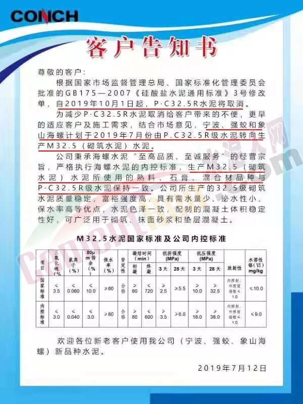 為減少P.C32.5R水泥取消給客戶帶來的不便,更早的適應客戶及施工需求,結合市場意見,寧波、強蛟和象山海螺計劃于2019年7月份由P.C32.5級水泥轉向生產M32.5(砌筑水泥)水泥。