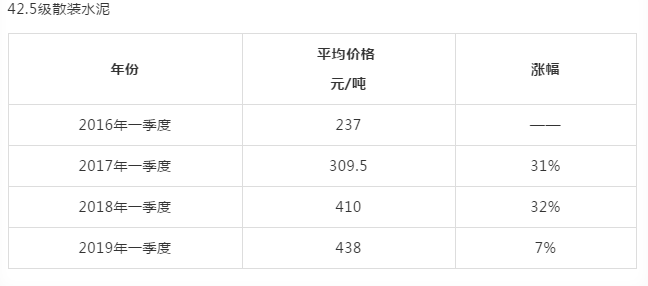 國家統(tǒng)計局?jǐn)?shù)據(jù)顯示,自2016年一季度以來,水泥價格逐年上漲。從2016年季度的237元/噸,到2019年一季度勻價438元/噸,三年多時間漲幅達85%,而整個水泥行業(yè)的利潤從2015年的14.29元/噸提高到2018年的71.29元/噸。