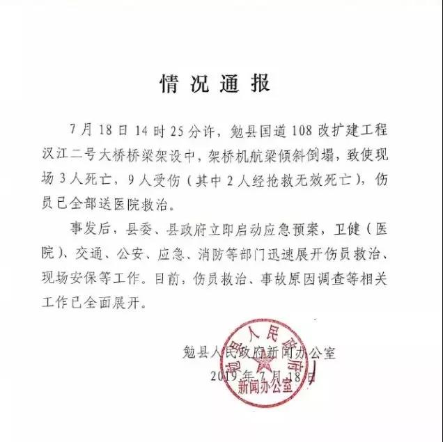 本周四(18日),陜西省漢中市勉縣人民政府發(fā)布通報(bào),當(dāng)日14時(shí)25分許,勉縣國(guó)道108改擴(kuò)建工程漢江二號(hào)大橋橋梁架設(shè)中架橋機(jī)航梁倒塌,共造成5死7傷。死傷者皆為施工工人,原因正在調(diào)查中。