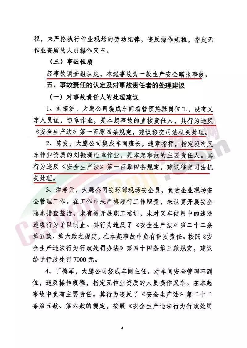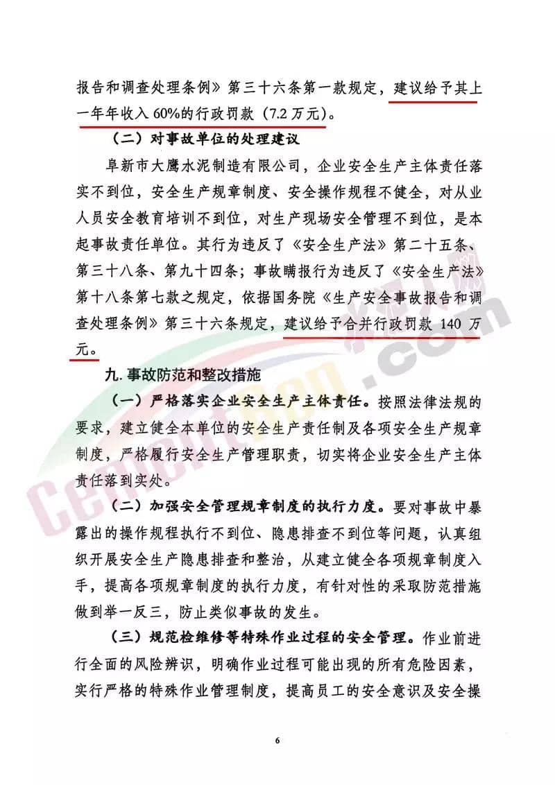 因事故主要責(zé)任人劉某違反《安全生產(chǎn)法》第一百零四條規(guī)定,建議移交司法機(jī)關(guān)處理。陳某,違章指揮,指定沒(méi)有叉車作用資質(zhì)的劉某違章作業(yè),是本起事故的主要責(zé)任人,其行業(yè)違反《安全生產(chǎn)法》第一百零四條規(guī)定,建議移交司法機(jī)關(guān)處理。其他相關(guān)人員,處以行政處罰15000-7000元不等,負(fù)責(zé)企業(yè)全面工作的企業(yè)法人建議給予其上一年年收入的60%行政罰款。阜新市大鷹水泥因企業(yè)安全生產(chǎn)主體責(zé)任落實(shí)不到位等違反了《安全生產(chǎn)法》相關(guān)規(guī)定,依據(jù)相關(guān)條例規(guī)定,建議給予合并行政罰款140萬(wàn)元。