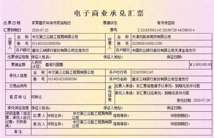 近日,票據(jù)市場上出現(xiàn)了重慶三峽銀行股份有限公司空港支行以中交第三公路工程局有限公司名義出具的電子商業(yè)承兌匯票,重慶三峽銀行股份有限公司空港支行不是中交第三公路工程局有限公司的合作銀行,該商業(yè)承兌匯票不是中交第三公路工程局有限公司出具,請各機構、社會公眾注意識別,以免造成損失。