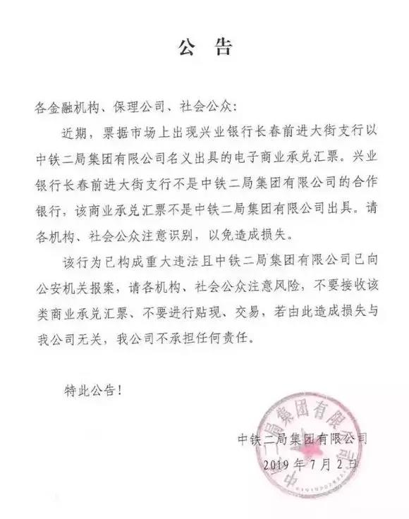 不久前中鐵二局也曾發(fā)布類似的通知稱票據(jù)市場上出現(xiàn)興業(yè)銀行長春前進大街支行以中鐵二局集團有限公司名義出具的電子商業(yè)承兌匯票,興業(yè)銀行長春前進大街支行不是中鐵二局集團有限公司的合作銀行,該商業(yè)承兌匯票不是中鐵二局集團有限公司出具。