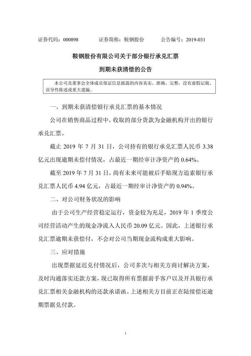 據(jù)水泥人網(wǎng)了解,鞍鋼股份日前發(fā)布的一則“部分銀行承兌匯票到期未獲清償”的公告迅速引發(fā)市場關注。截至7月31日,尚有未來可能被后手貼現(xiàn)方追索銀行承兌匯票4.94億元,兩者銀行承兌票據(jù)合計8.32億元。